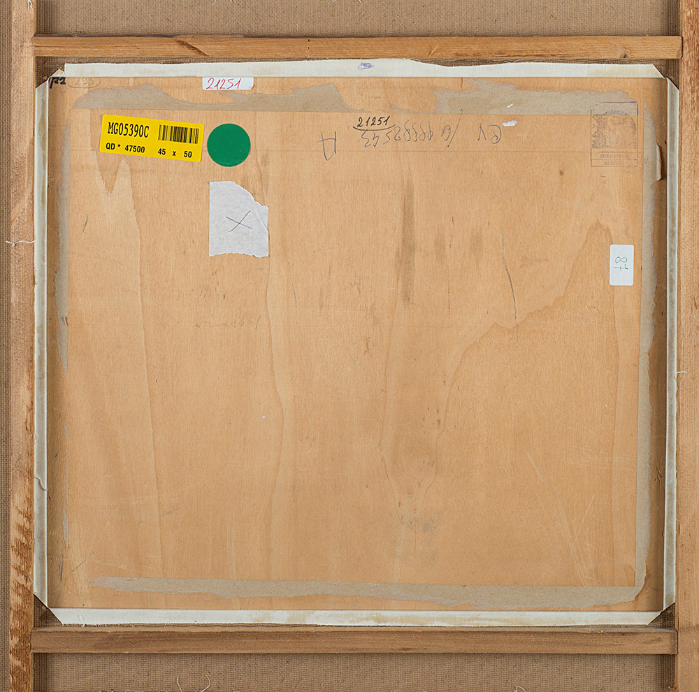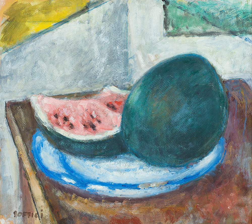 Ardengo Soffici (1879-1964), Natura morta con anguria, 1962 ca , olio su cartoncino applicato su tavola di compensato , 44,5x49,5 Firmato in basso a sinistra: SOFFICI Prato, Galleria d'Arte Farsetti, (n. d'archivio 21251); Brescia, Galleria d'Arte Schreiber (timbro al verso); collezione privata.