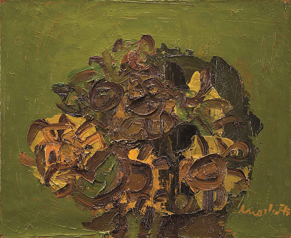 Ennio Morlotti (1910-1992), Girasoli, 1976, olio su tela , cm 46x38 Firmato in basso a destra: Morlotti Milano, Breraarte; Milano, Galleria Nuova (timbro al verso); collezione privata. G. Bruno, Ennio Morlotti, Catalogo ragionato dei dipinti, tomo II, Skira editore, Milano 2000, p.537, n.1524 (riprodotto).