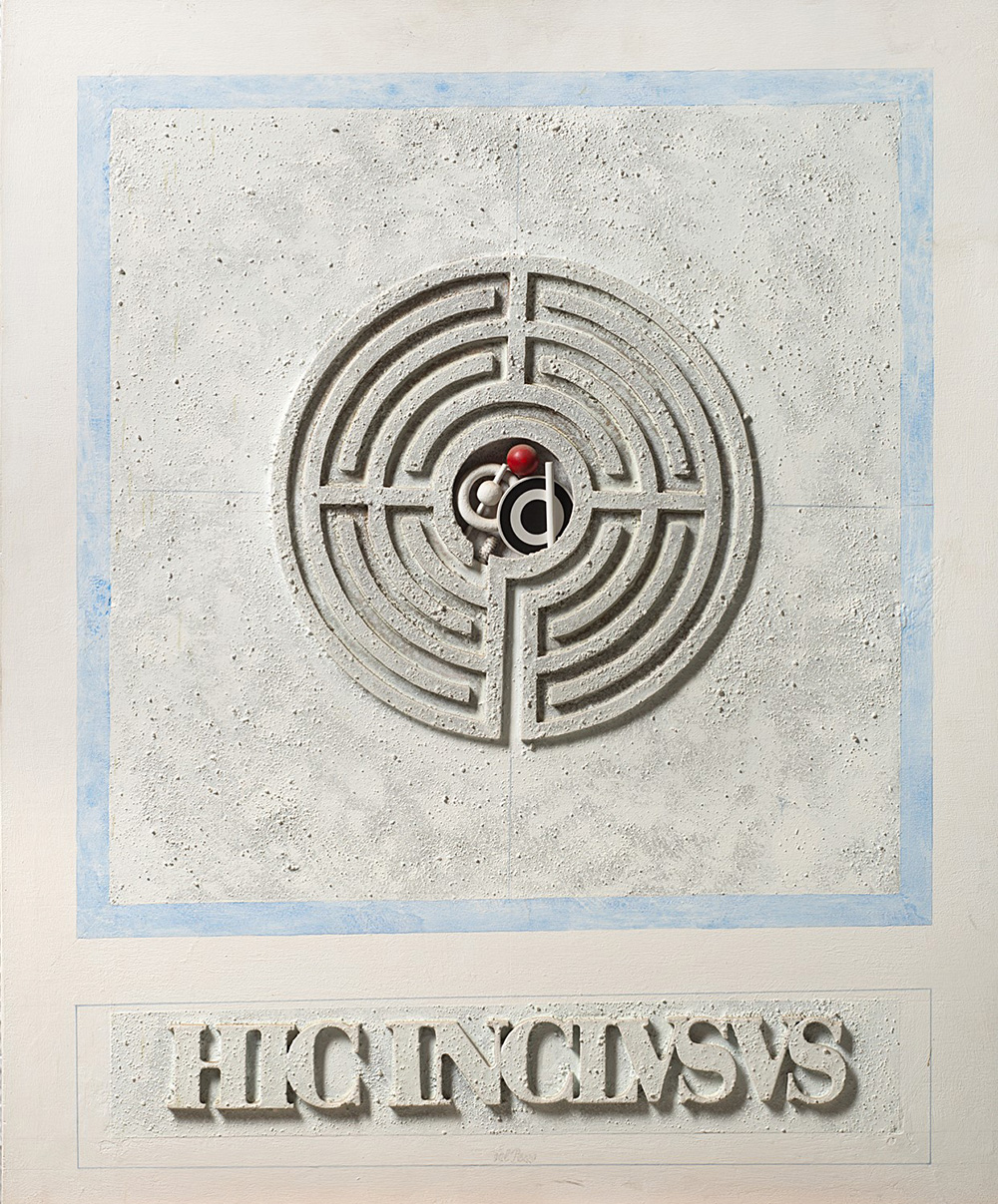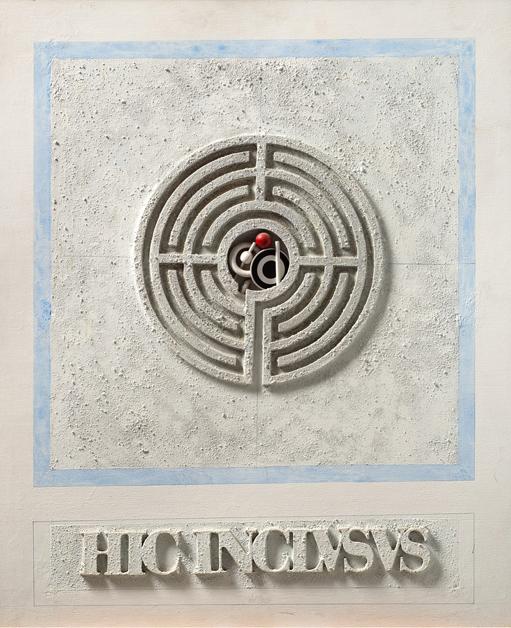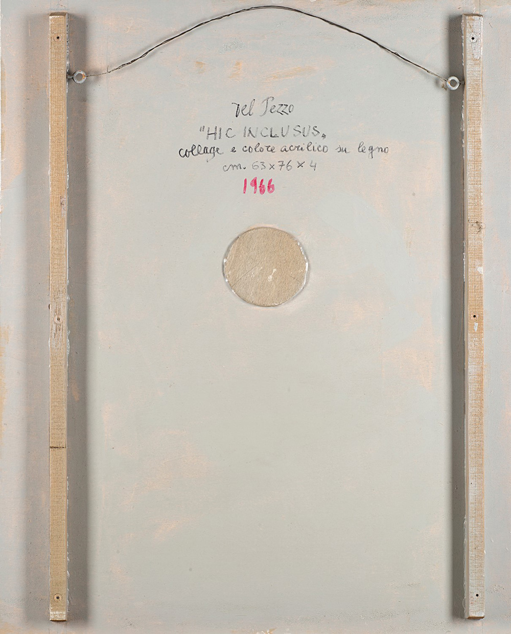 Lucio Del Pezzo (1933), Hic inclusus, 1966, collage e acrilico su legno, cm 76x63x4 Firmato, titolato e datato al verso: Del Pezzo, "HIC INCLUSUS", 1966 Milano, collezione privata.