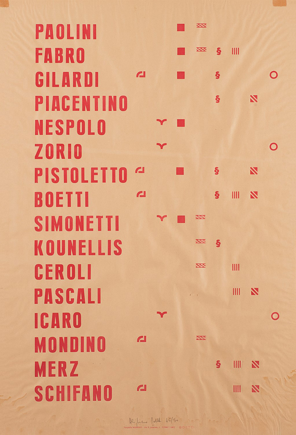 Alighiero Boetti (1940-1994), Manifesto,1970, stampa offset, cm 100x70 Edizione 46/50 Firmato e numerato in basso al centro: Alighiero Boetti 46/50 Collezione Aldo Mondino; Milano, collezione privata.