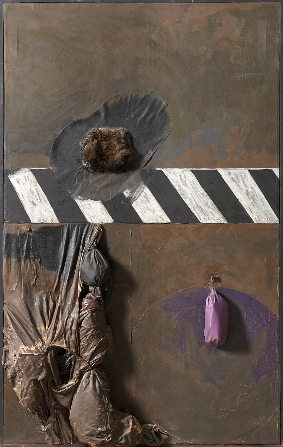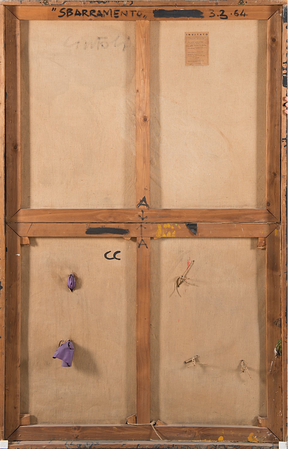 Claudio Cintoli (1935-1978), Sbarramento, 1964, collage e tecnica mista su tela, cm 160x100 Titolato, datato e firmato al verso: "SBARRAMENTO", 3.3.64, Cintoli Roma, Galleria Scarchilli; collezione privata. Roma, Fondazione Premio di Pittura F. P. Michetti, aprile - settembre 1964 (etichetta al verso); Polignano a Mare, Fondazione Museo Pino Pascali, Dialoghi.3.0: Pino Pascali e Claudio Cintoli, 24 marzo-30 settembre 2018. AA. VV., Dialoghi.3.0: Pino Pascali e Claudio Cintoli, Catalogo della mostra, Ed. Fondazione Pino Pascali, Polignano a Mare 2018, s.p. (riprodotto).