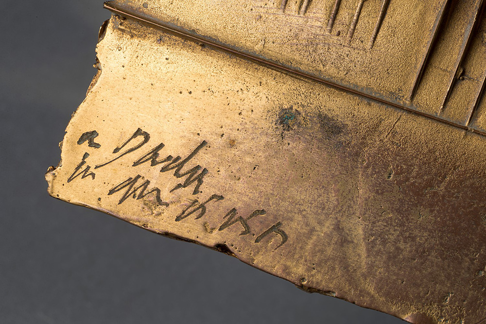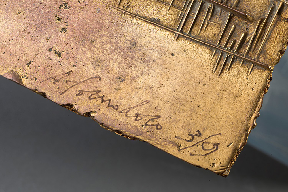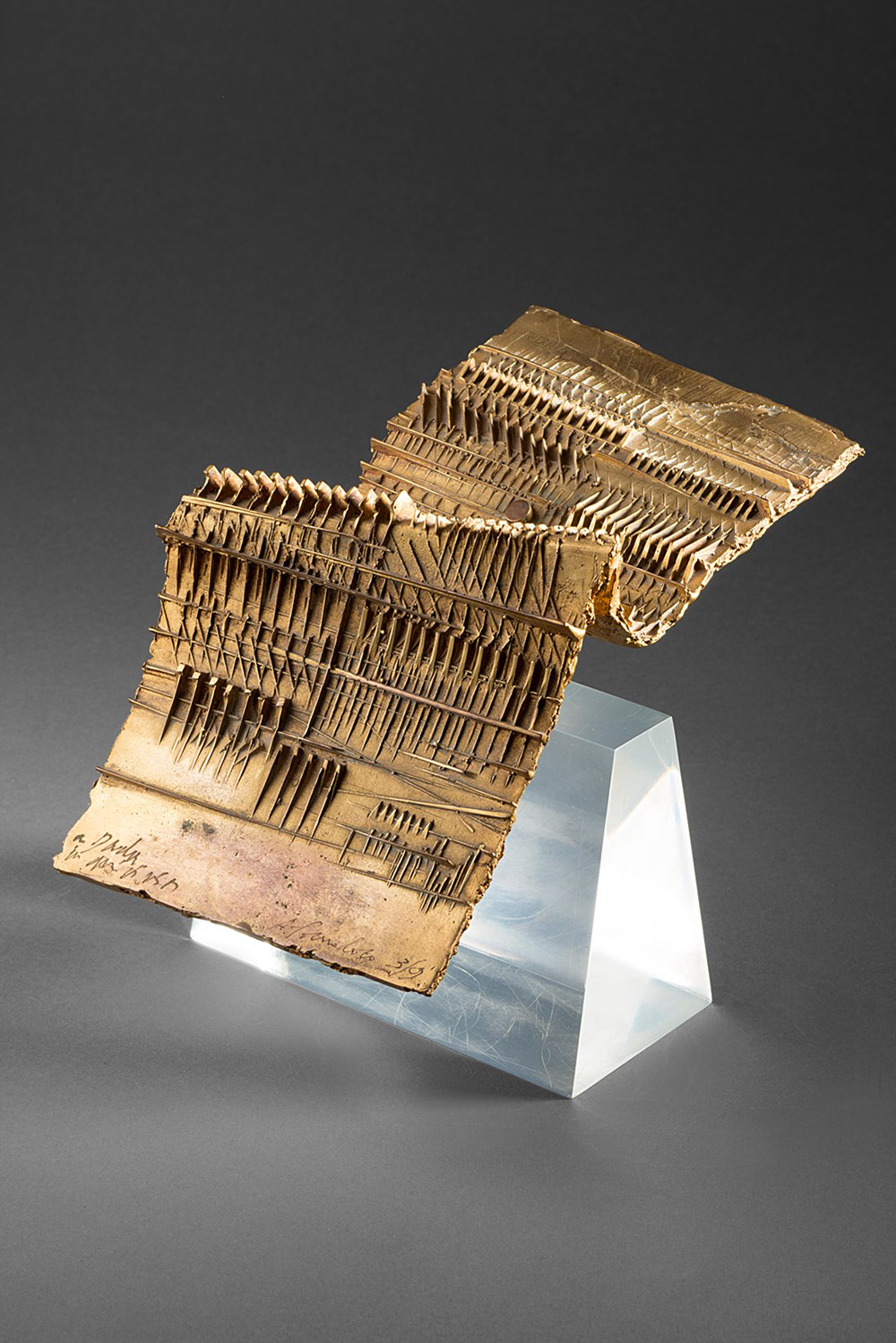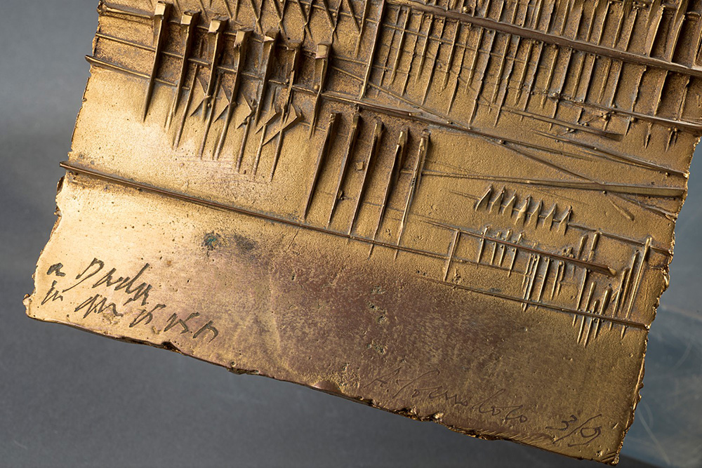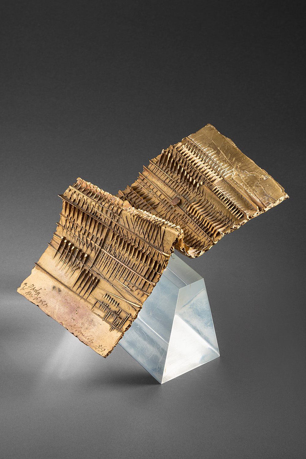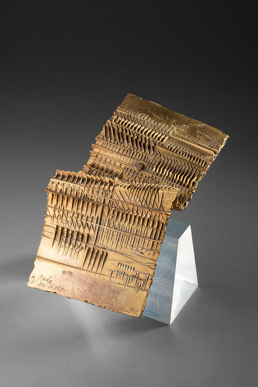 Arnaldo Pomodoro (1926), Foglio, bronzo dorato , cm 23x11x8 Edizione n. 3/9 9 esemplari + 3 prove d'artista Firmato e numerato a destra: A. Pomodoro 3/9 Dedicato a sinistra: a Dada con amicizia F. Gualdoni, Arnaldo Pomodoro. Catalogo ragionato della scultura, Skira Editore, Milano 2007, n. 781, p. 657 (riprodotto).