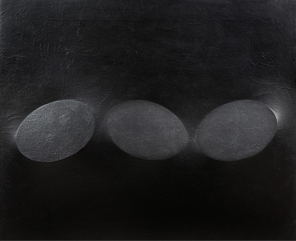 Turi Simeti (1929), Tre ovali neri, 1988, acrilico su tela sagomata, cm 90x110 Firmato e datato sul telaio al verso: Simeti '88 Firenze, collezione privata. AA. VV., Turi Simeti: catalogo generale, Vol. II, Christian Maretti Editore, Faenza 2007, p. 67 (riprodotto).