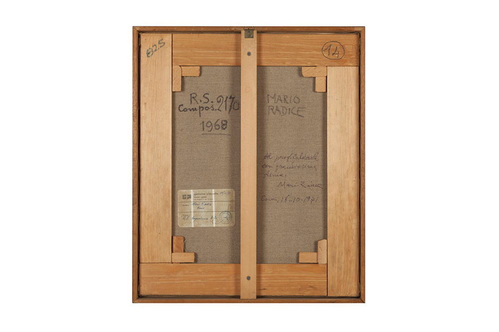 Mario Radice (1898-1987), Composizione R.S. 2168, 1968, olio su tela, cm60x49 Firmato, titolato e datato al verso: MARIO RADICE R. S. Compos. 2170 1968 Dedica al verso Cantù (LC), Galleria Pianella (etichetta al verso); Milano, collezione prof. Piero Caldirola.