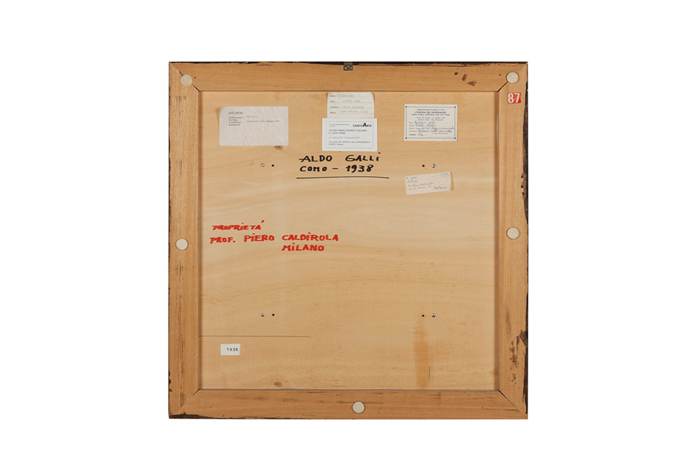 Aldo Galli (1906-1981), Rilievo, 1938, legno verniciato, cm 37X37 Firmato e datato al verso: ALDO GALLI COMO - 1938 Iscrizione al verso: PROPRIETA' / PROF. PIERO CALDIROLA / MILANO Milano, collezione prof. Piero Caldirola; Milano, collezione privata. Genova, Galleria La Polena, Panorama Uno, 10 giugno - 30 luglio 1966; Monza, Galleria Civica d'Arte Moderna, Aspetti del primo astrattismo italiano 1930-1940, 1-31 marzo 1969; Como, Palazzo Volpi, L'Europa dei Razionalisti. Pittura, scultura, architettura negli anni Trenta, 20 maggio - 27 agosto 1989 (etichetta al verso); Milano, Galleria San Fedele, Gli astrattisti del Gruppo Como dagli anni Trenta ad oggi. Radice, Rho, Badiali, Galli, Prina, 7 - 30 marzo 1972; Roma, Palazzo delle Esposizioni, X Quadriennale d'Arte, sez. Situazione dell'arte non figurativa, 8 febbraio - 25 marzo 1973; Como, Palazzo Volpi, L'Europa dei Razionalisti. Pittura, scultura, architettura negli anni Trenta, 20 maggio - 27 agosto 1989 (etichetta al verso); Milano, Arte Centro, Aldo Galli, aprile - maggio 2000 (etichetta al verso); Cantù, Associazione Galleria del Design e dell'Arredamento, Astrattismo storico italiano. Il caso Como, 21 ottobre 2001 - 20 gennaio 2002 (etichetta al verso). L. Cavadini, Aldo Galli, catalogo generale, Cesarini Editrice, Como 2003, p. 38, n. 38 5 (riprodotto); L. Caramel, Aspetti del primo astrattismo italiano 1930-1940, catalogo della mostra, Monza 1969, p. 70, n. 2 e p. 71 (riprodotto); P. Fossati, Un'antologia di Galli, "L'Unità", Torino, 18 giugno 1969 (riprodotto); P. Fossati, 1930/40, I tempi e gli uomini dell'astrattismo italiano, "Arte illustrata", a. II, nn. 22-23-24, Milano, ott-nov-dic 1969; P. Fossati, Aldo Galli, Prefazione di A. Sartoris, Scheiwiller, Milano 1976, n. 3 e p. 119, n. 3 (riprodotto); M. Di Salvo, Lo Spazio Armonico, Collegio delle imprese edili ed affini della Provincia di Como, Como 1987, p. 115 (riprodotto).