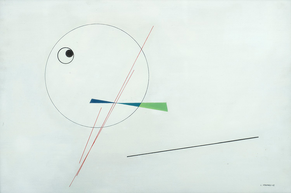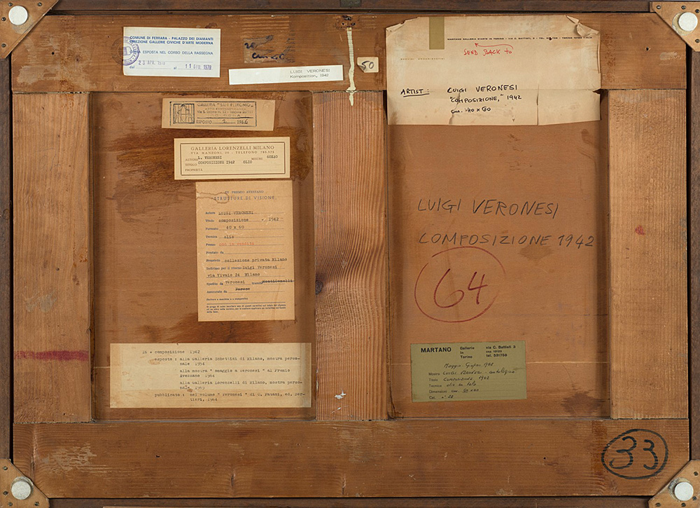 Luigi Veronesi (1908-1998), Composizione, 1942, olio su tavola , cm 40x60 Firmato e datato in basso a destra: L. Veronesi 42 Firmato, titolato e datato al verso: Luigi Veronesi Composizione 1942 Bologna, Galleria San Petronio (etichetta al verso); Torino, Galleria Martano (etichetta al verso); Milano, Galleria Lorenzelli (etichetta al verso); Milano, collezione Alice Cazzola; Milano, collezione privata. Milano, Galleria Schettini, Luigi Veronesi, 1953 - 1954; Avezzano, XV Premio Avezzano, Strutture di Visione, Omaggio a Veronesi, 1964 (etichetta al verso); Milano, Galleria Lorenzelli, Luigi Veronesi, 1965 (etichetta al verso); Bologna, Galleria San Petronio, Veronesi, 1966; Torino, Galleria Martano, Luigi Veronesi antologica, maggio-giugno 1968 (etichetta al verso); Ferrara, Galleria Civica d'Arte Moderna, Palazzo dei Diamanti, Luigi Veronesi, 23 aprile-10 giugno 1978 (etichetta e timbro al verso). O. Patani, Veronesi, Ed. Bertieri, Milano 1964.