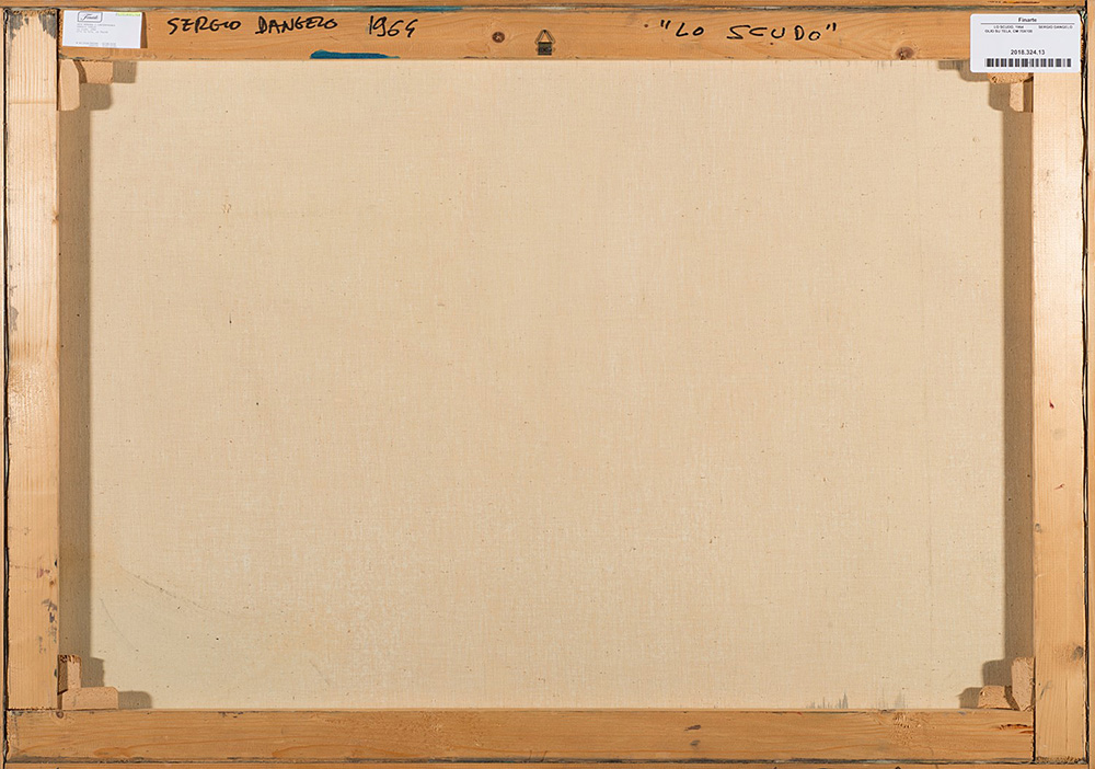 Sergio Dangelo (1932), Lo scudo, 1964, tecnica mista su tela, cm 70x100 Firmato e datato in basso al centro: Dangelo 1964 Firmato, datato e titolato al verso: Sergio Dangelo "Lo scudo" 1964 Collezione privata.