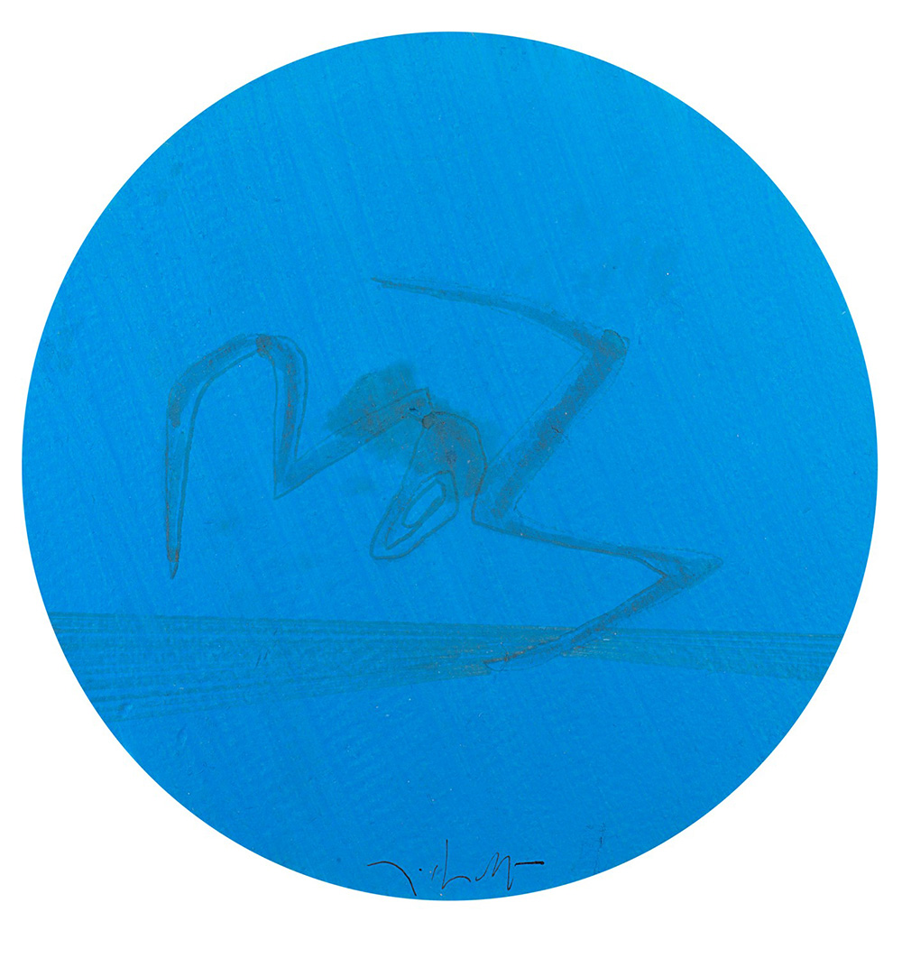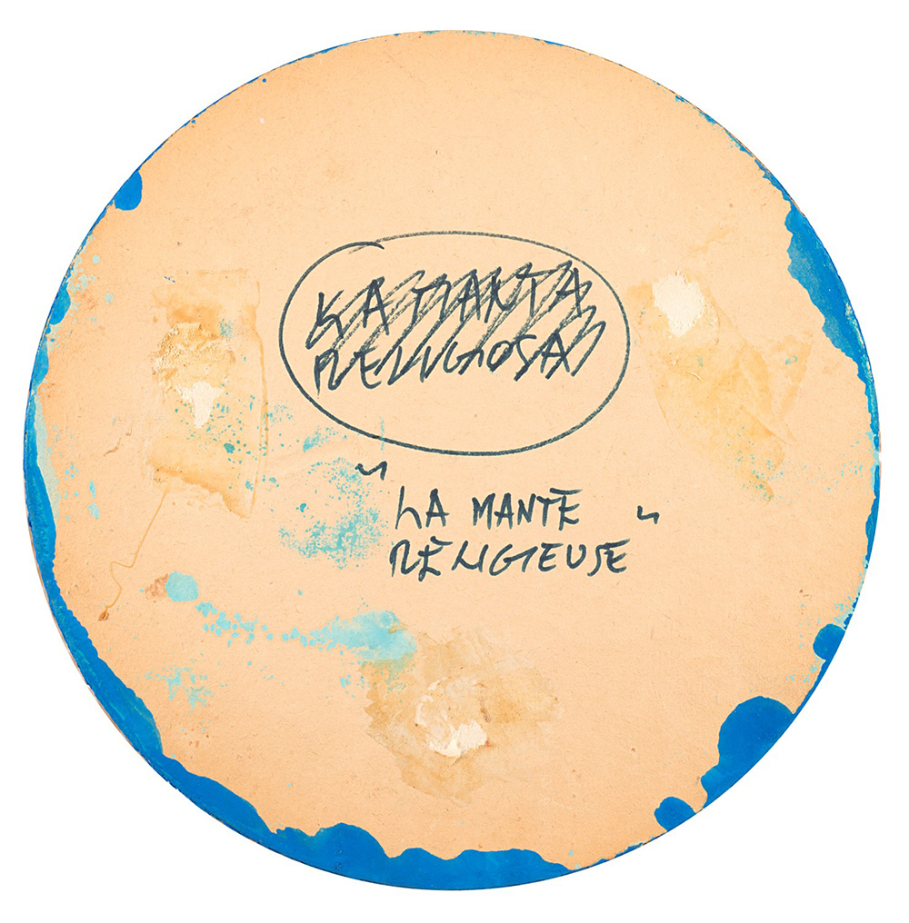 Sergio Dangelo (1932), "La mante" religeuse, tempera su tondo di cartone, diametro cm 24 Firrmato in basso al centro: Dangelo Titolato al verso: "LA MANTE" RELIGEUSE Merano, collezione Luigi Serravalli; Merano, collezione eredi Serravali.