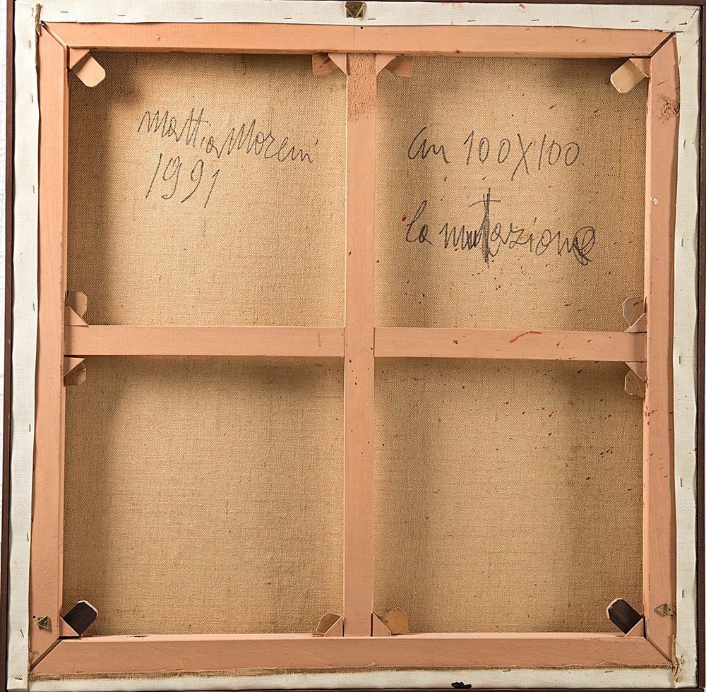 Mattia Moreni (1920-1999), "la mutazione" PERCHE'?, 1991, olio su tela, cm 102x102 Titolato in basso a sinistra: La mutazione PERCHE'? Firmato e datato in alto a destra: moreni 1991 Firmato, datato e titolato al verso: mattia moreni, 1991, la mutazione Collezione privata.