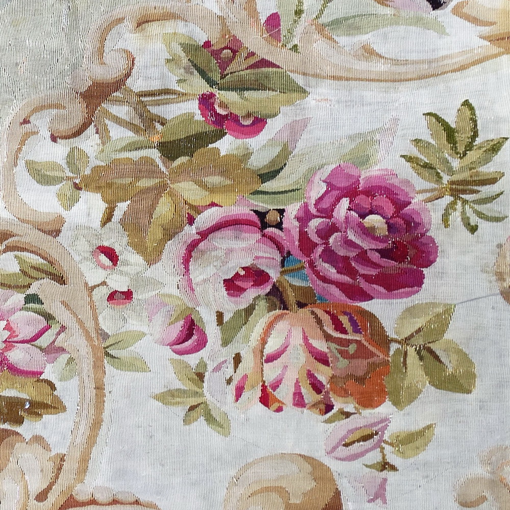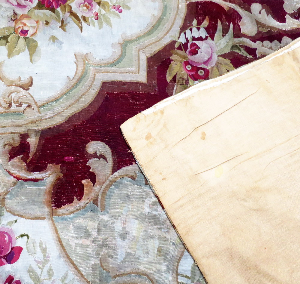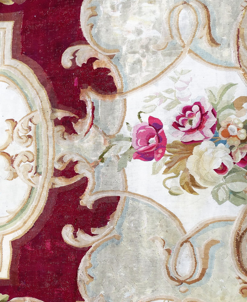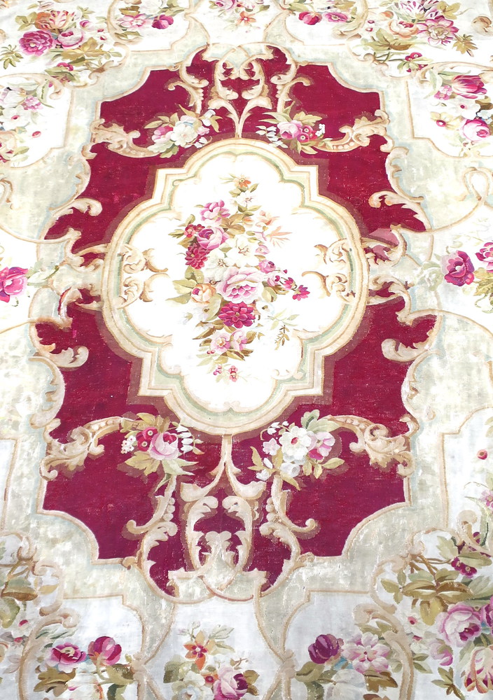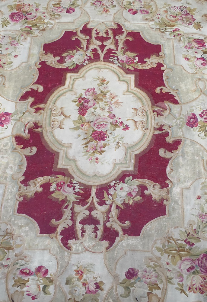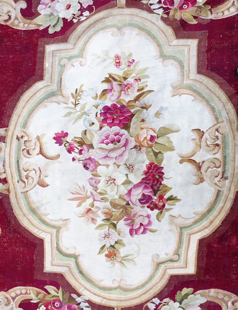 TAPPETO, Importante Aubusson a campo colore rosso con bordure decorate a motivi floreali. Francia XVIII sec. cm 320x250
