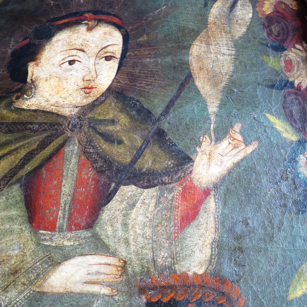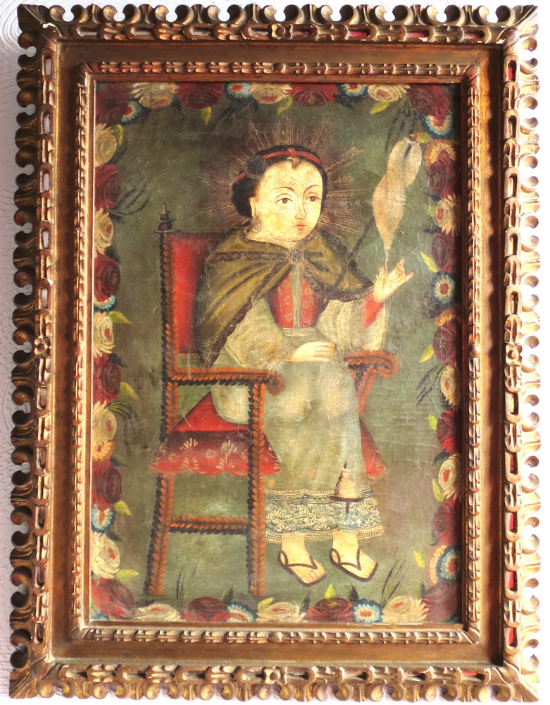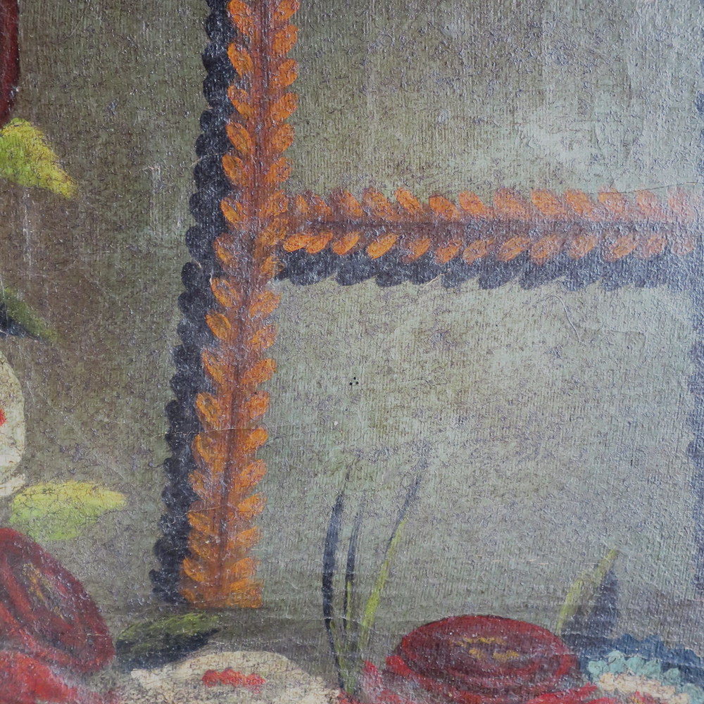 DIPINTO, Dipinto olio su tela raff. "figura in trono entro ghirlanda di fiori" - cm 56.1 x 81 - XIX sec.