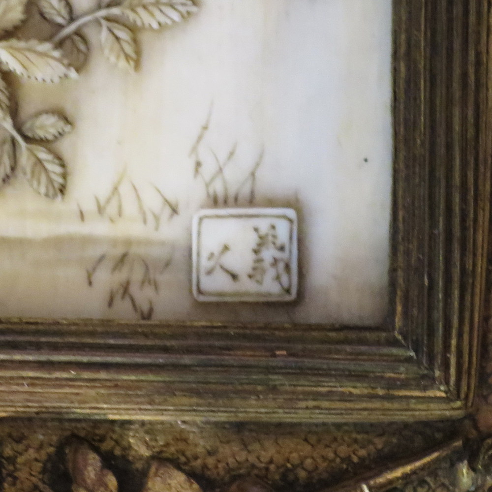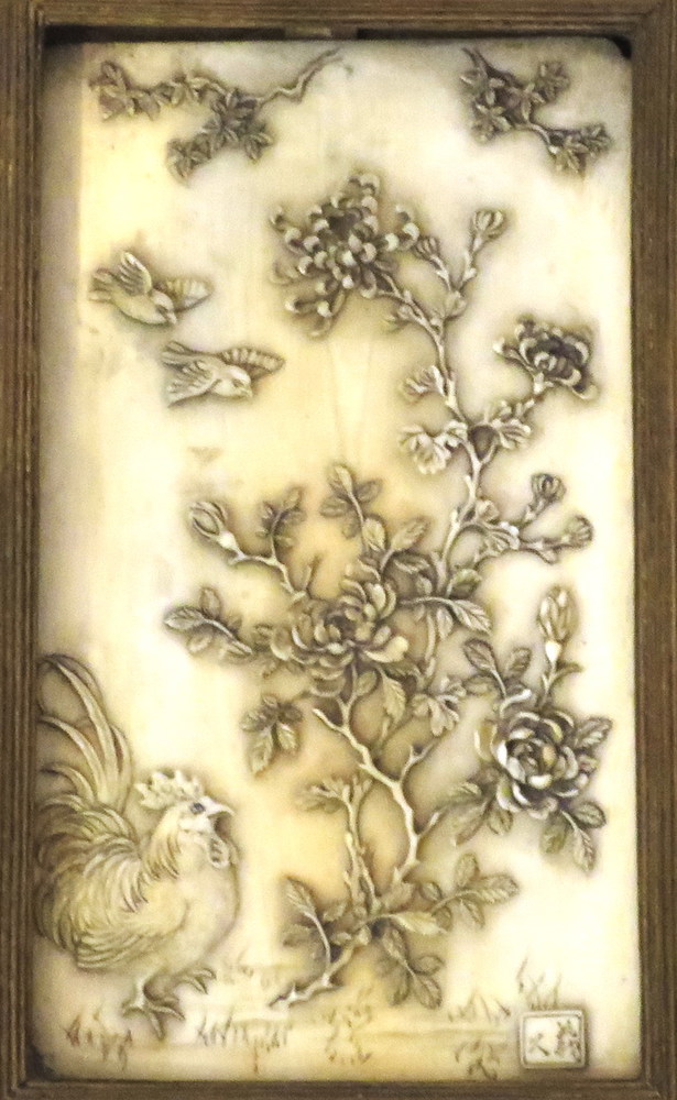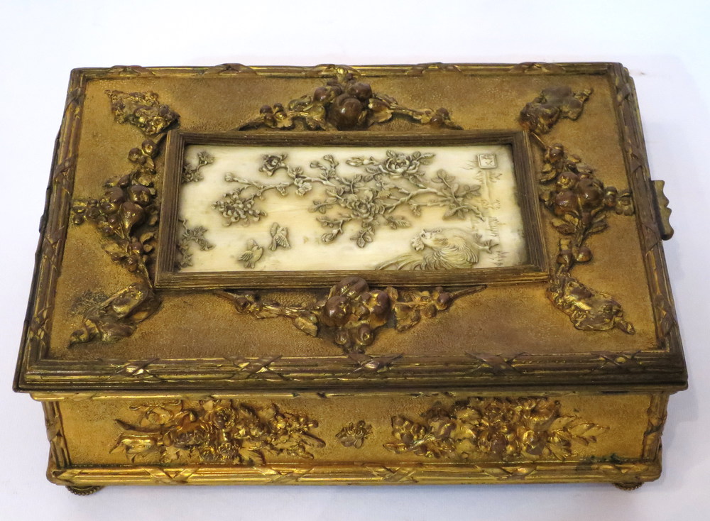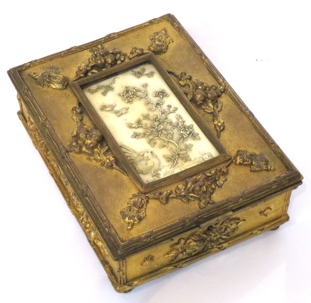 BRONZO, Scatola in bronzo dorato con decori, Francia - placca in avorio raff. gallo e tralcio di fiori Giappone periodo Meiji,firmata - cm 16 x 20.5 h 7 cm