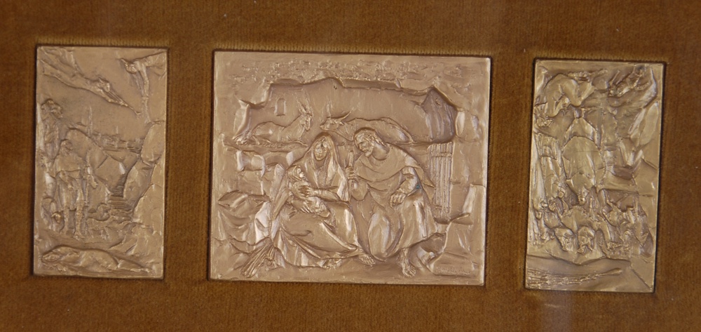ENRICO MANFRINI, Enrico Manfrini tre placche in metallo dorato raff. "presepe" - inizio XX sec. - cm 25 x 16