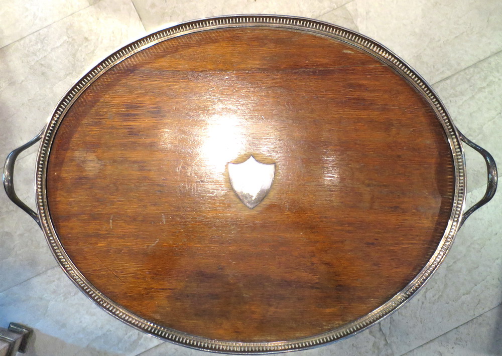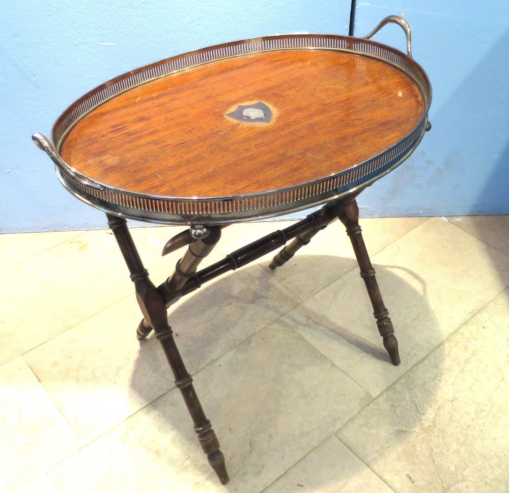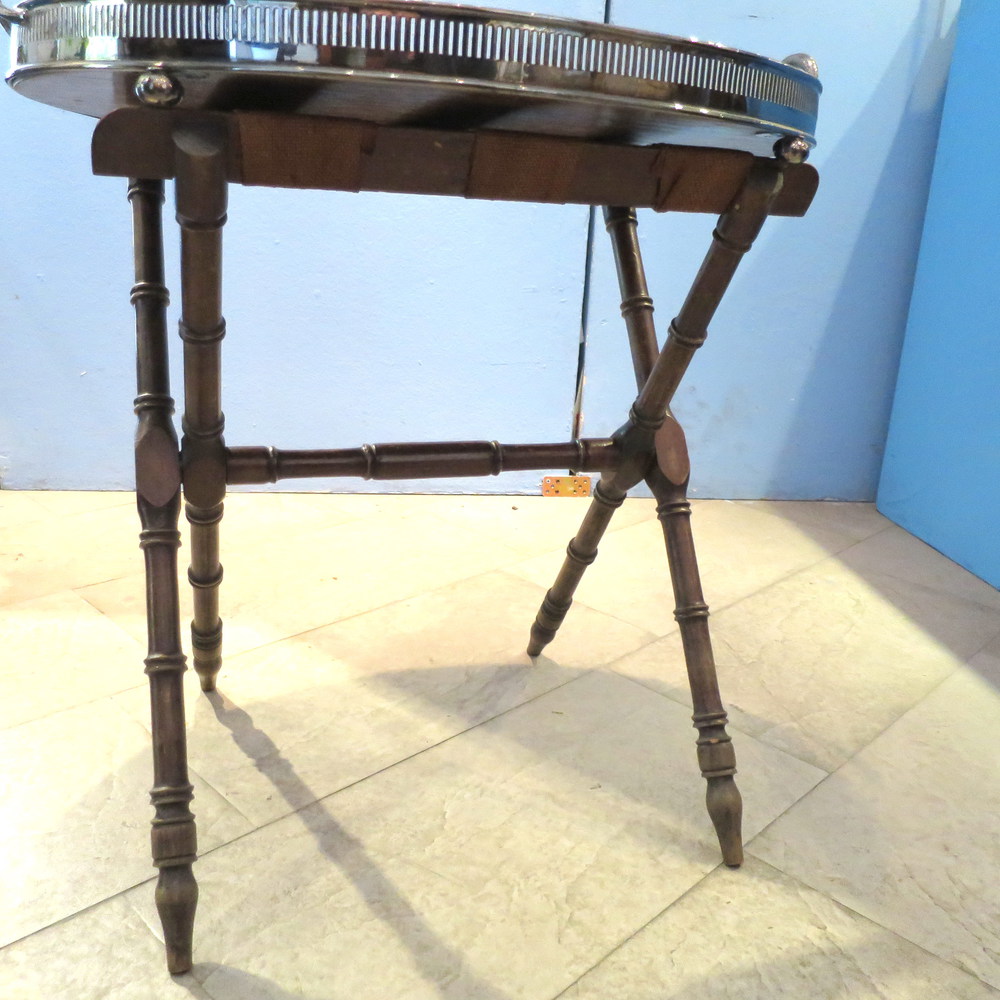 PORTA VASSOIO, Tavolino a cavalletti incrociati con vassoio al piano a profilo ringhiera traforato - Inghilterra Edoardo VII