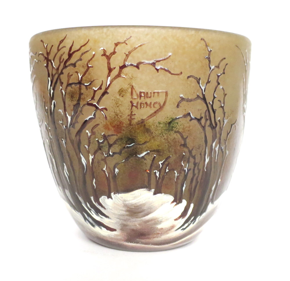 VASO, Vaso cachepot vetro cammeo inciso a rilievo "bosco innevato". Daum Nancy croce di Lorena cm.13,5x14,9