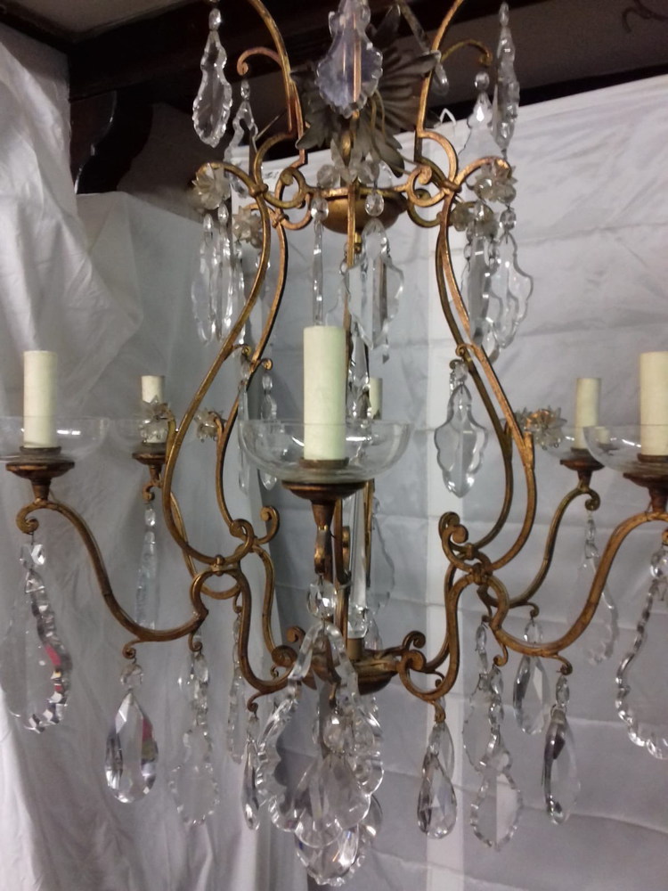 LAMPADARIO, Lampadario a sei luci in ferro dorato e sagomato con pendenti in...