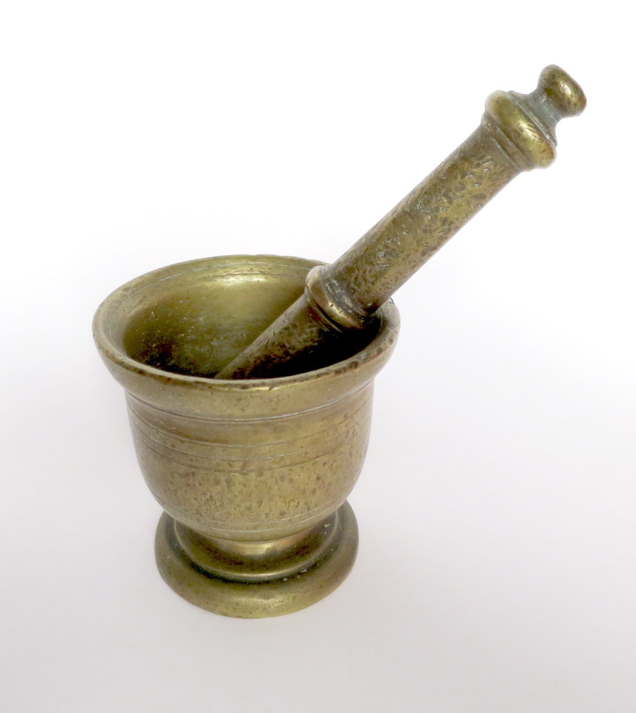 BRONZO, Mortaio con pestello in bronzo - H 11.5 cm Diam. 11.2 cm - XVIII sec