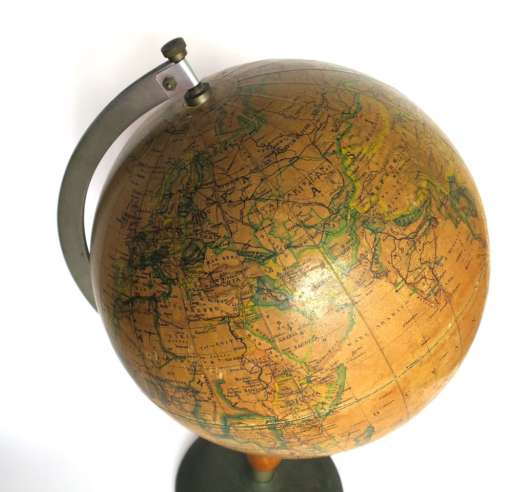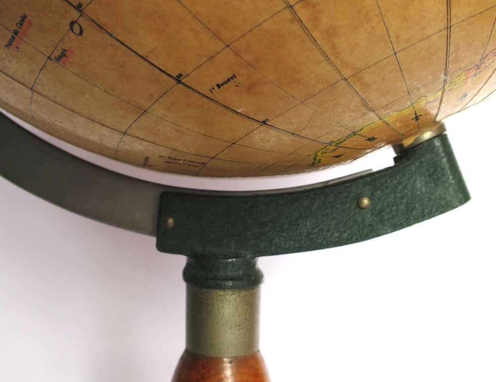 MAPPAMONDO, Mappamondo stampa acquerellata - Diam. 21 cm H 43 cm - 1940 circa