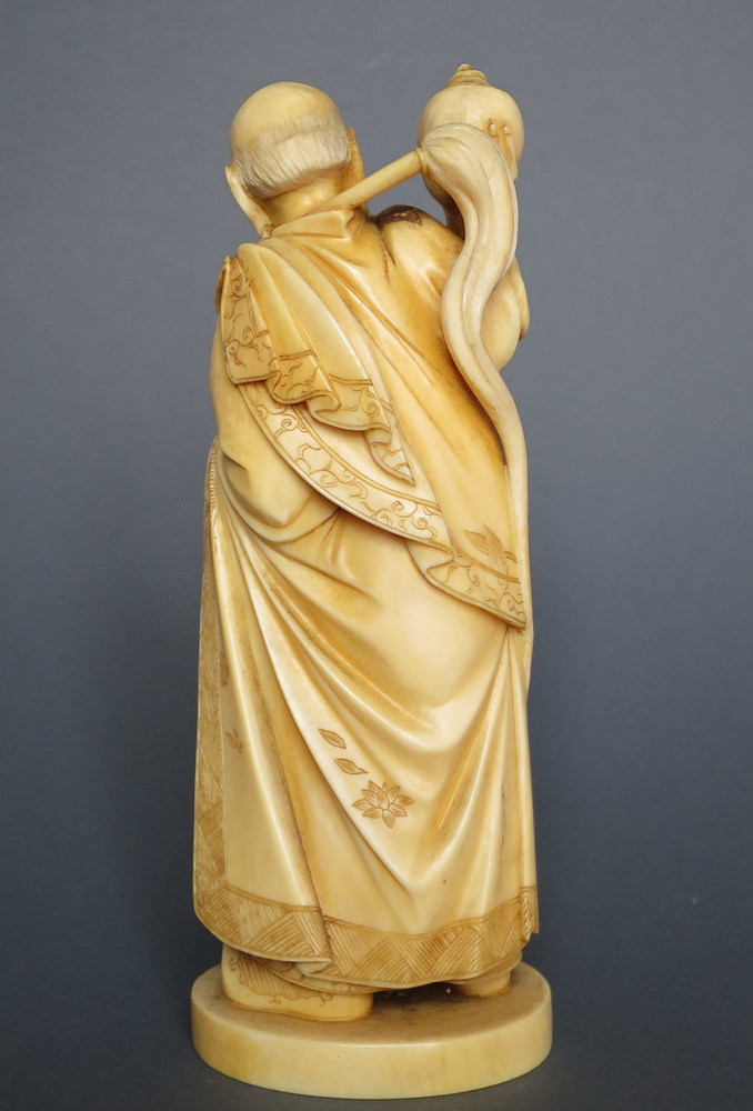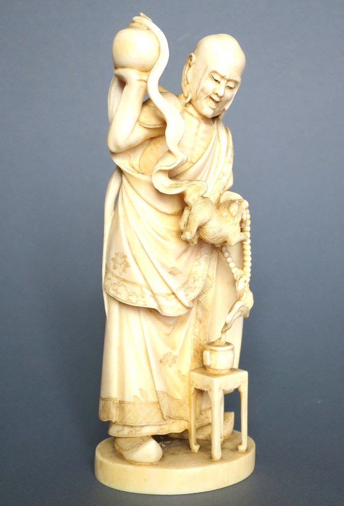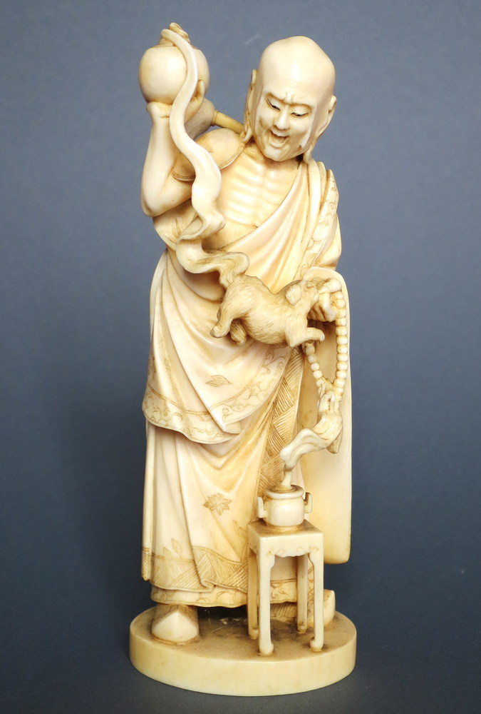GIAPPONE, Avorio "santone con cagnolino" - H cm 16.5 - firmato su madreperla - Giappone periodo Meiji