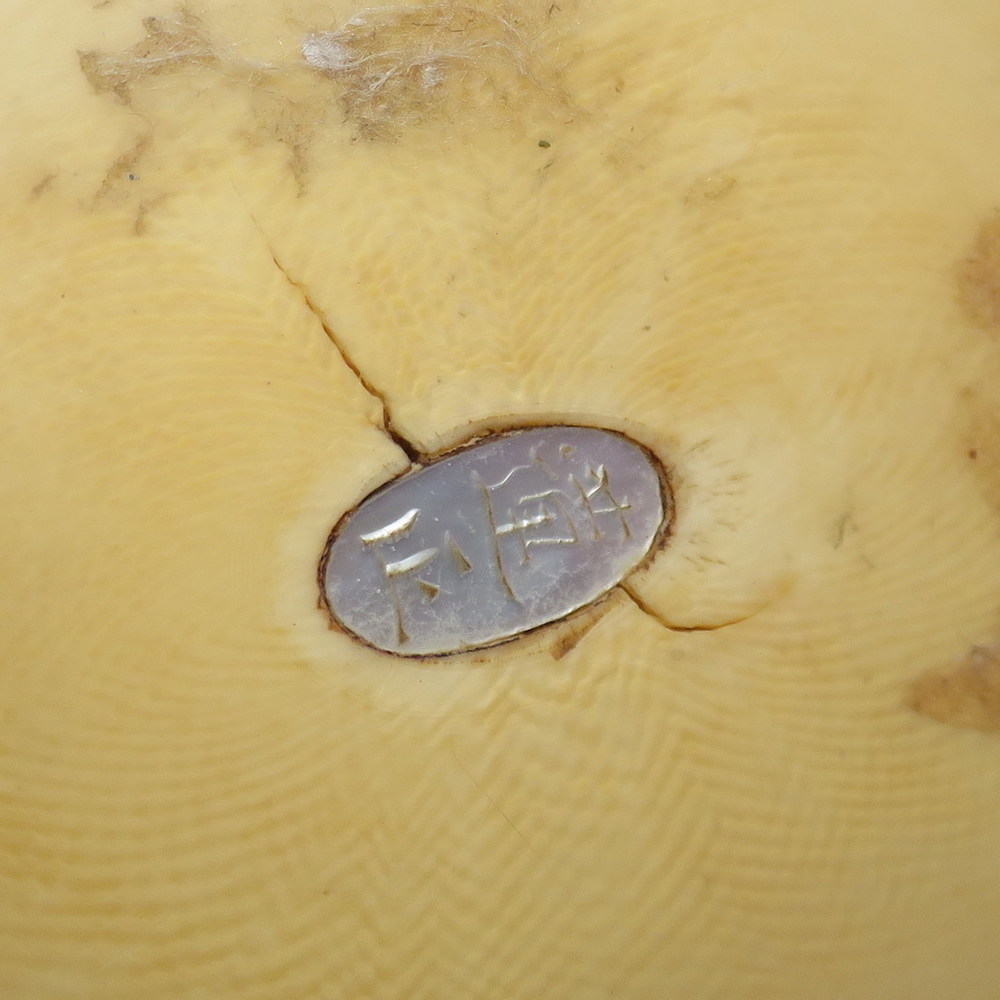 GIAPPONE, Avorio "santone con cagnolino" - H cm 16.5 - firmato su madreperla...