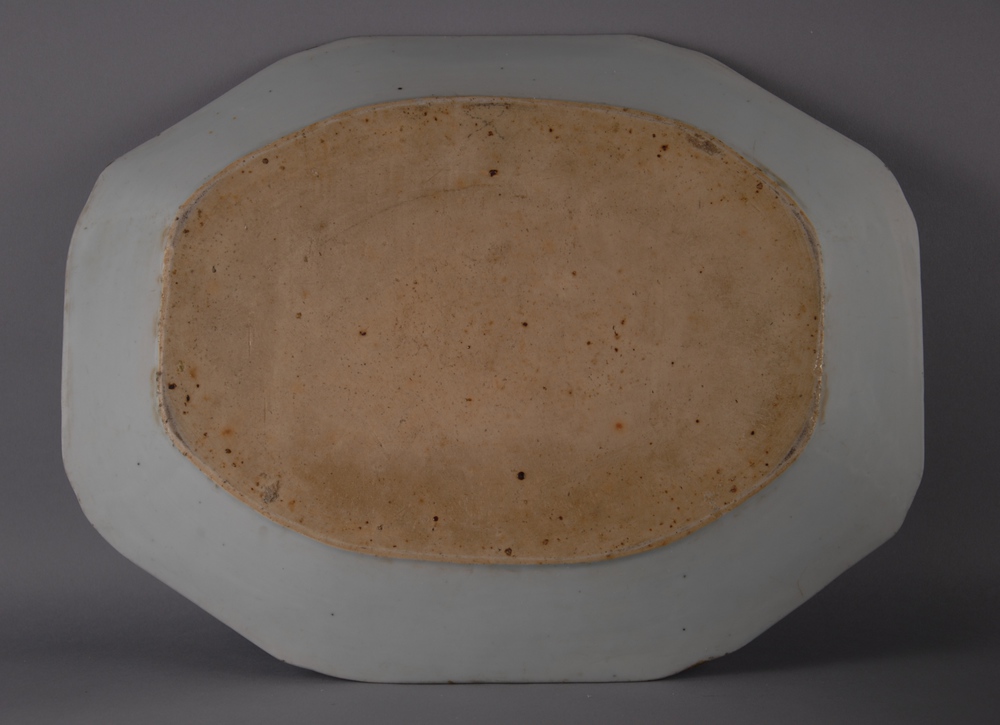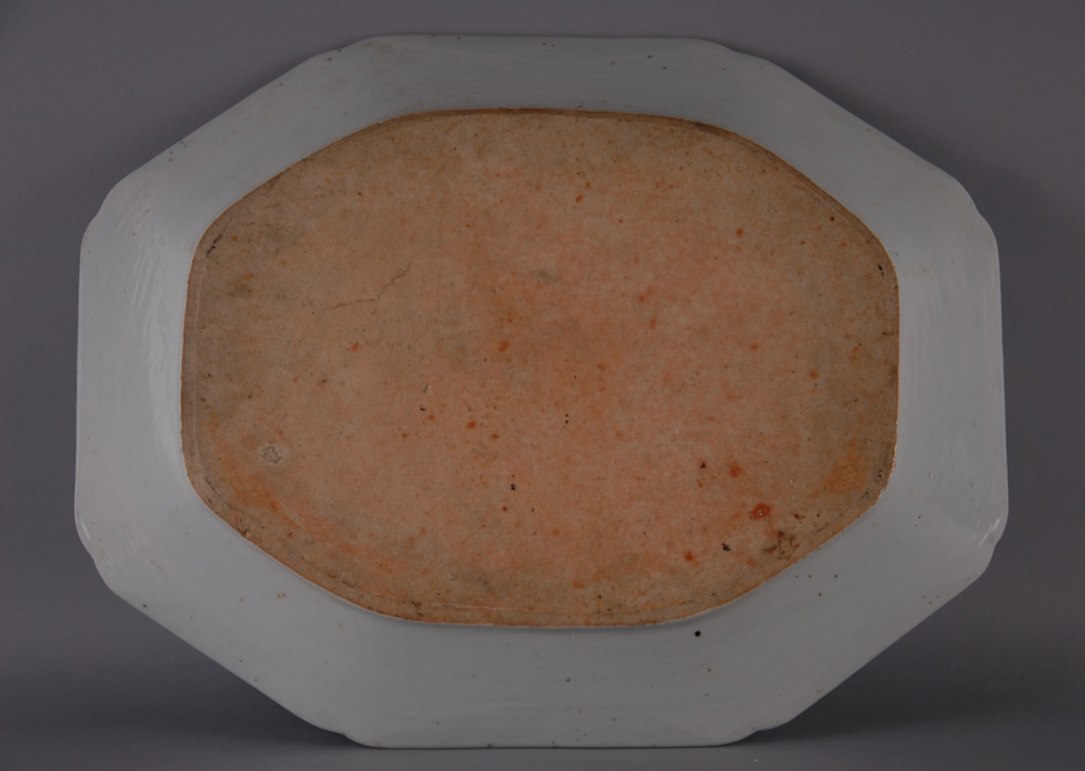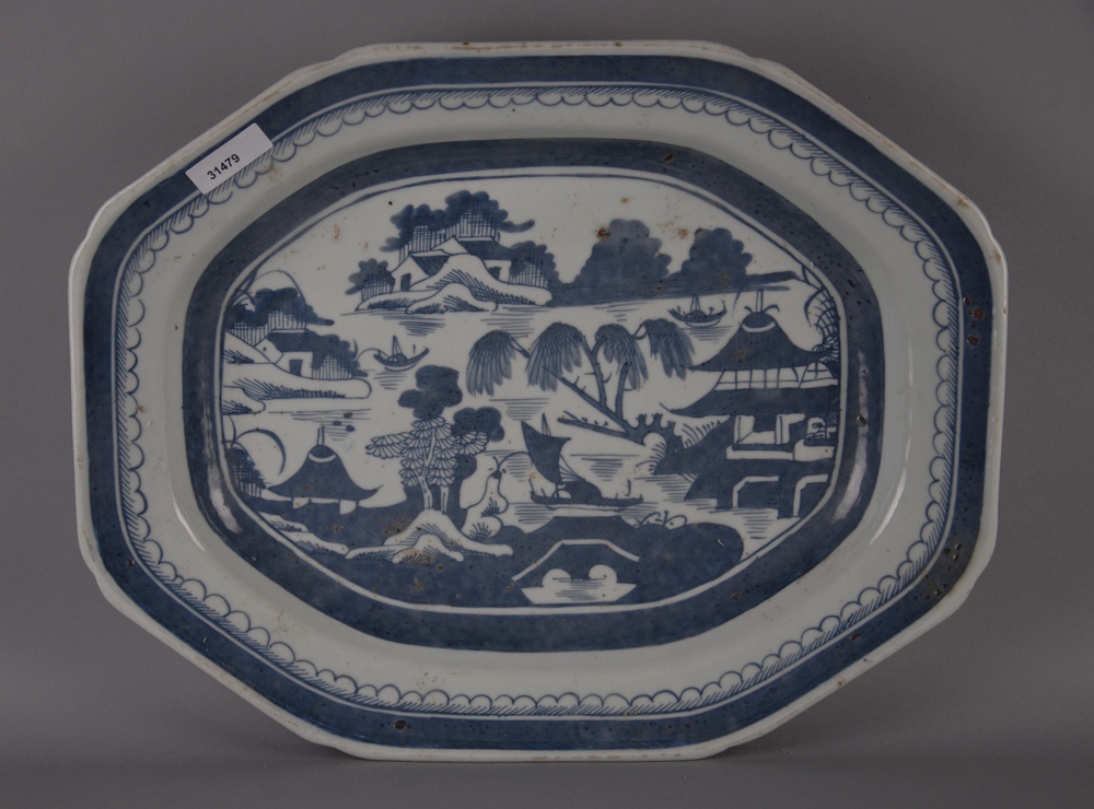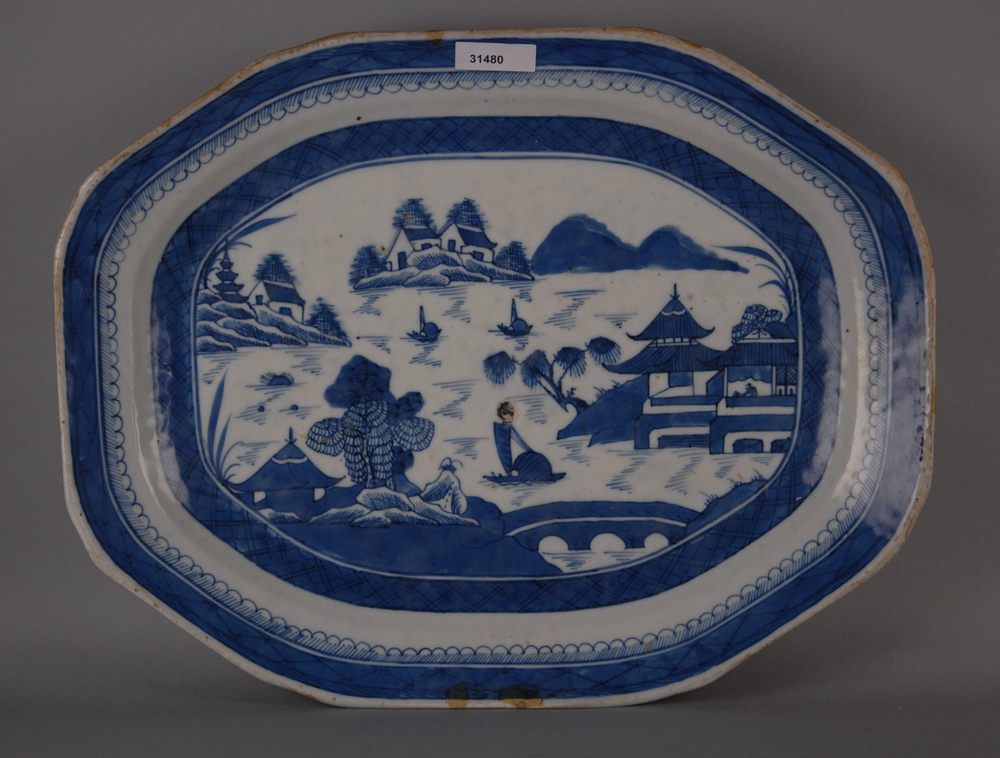 VASSOI, Due vassoi in ceramica bianca e blu di forma ottagonale con decoro raff. "paesaggio" - cm 40 x 32 - Cina XIX sec.