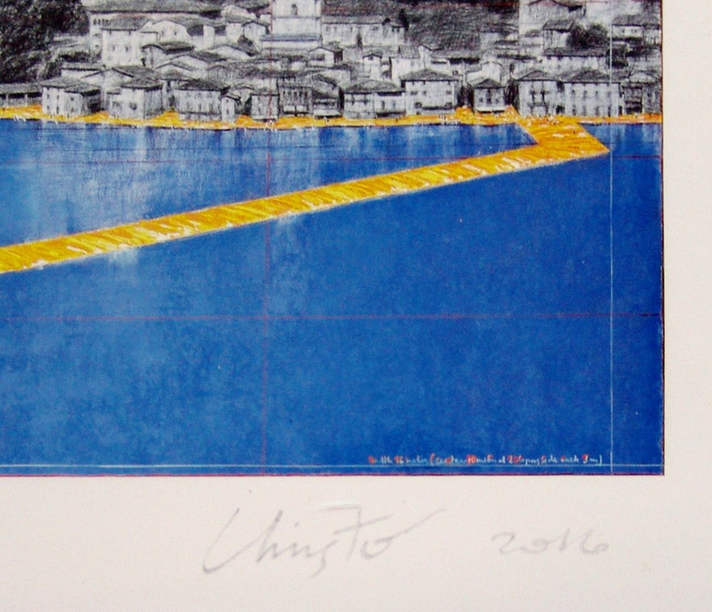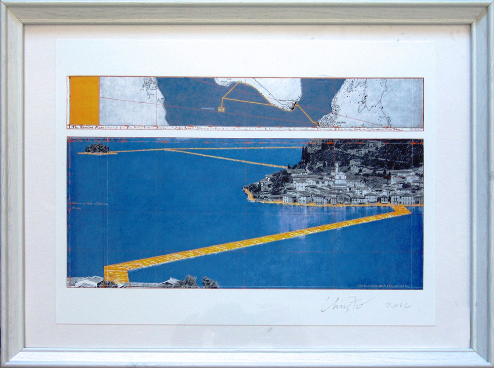 Christo 1935, Gabrovo (Bulgaria) - [USA] The Floating Piers, Project for Lake Iseo, Italy offset 25x33 cm 2016 firma dell’artista in basso a destra; opera con cornice certificato di autenticità Picenum