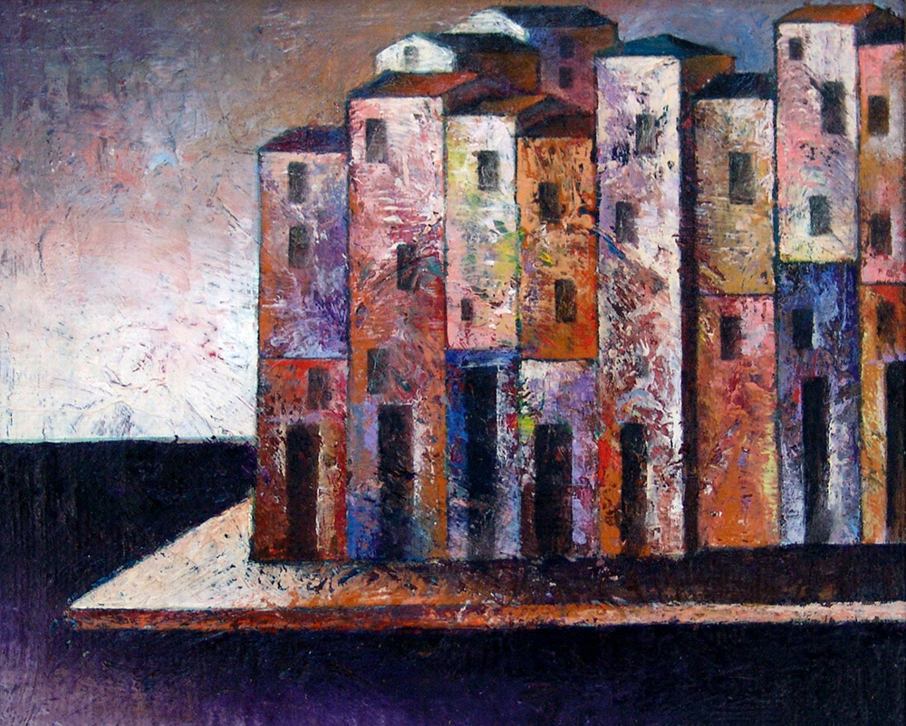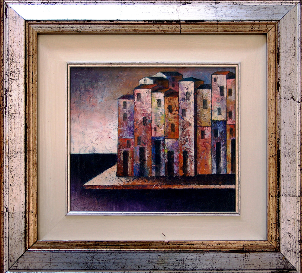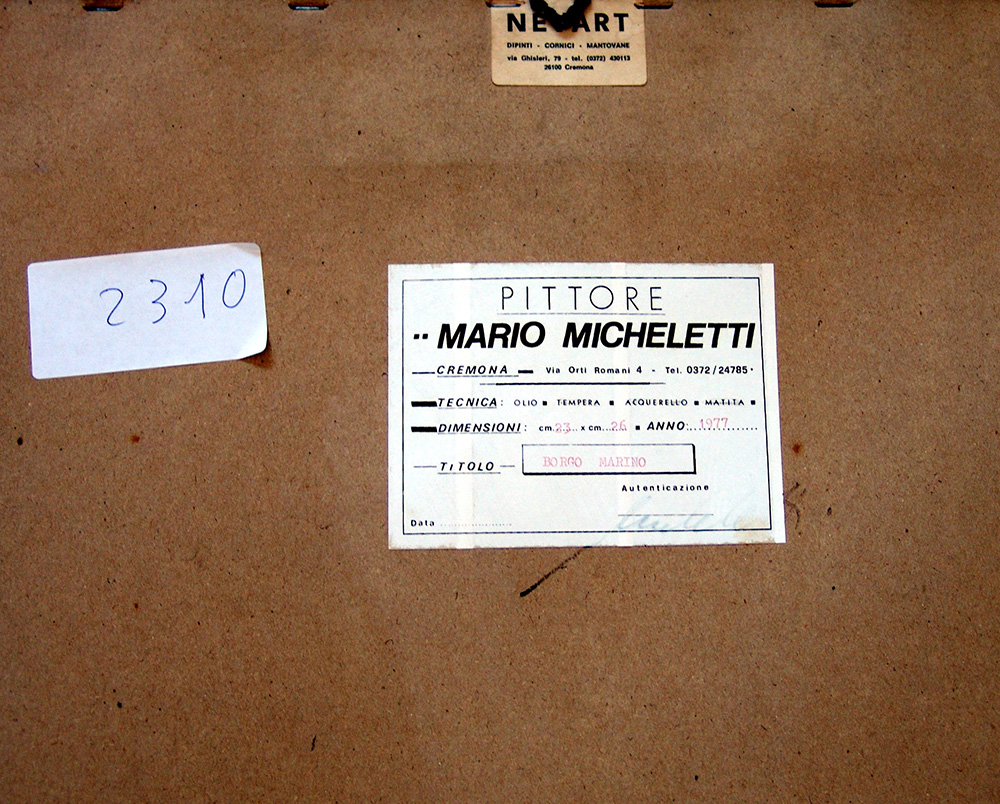 Mario Micheletti 1936, Bologna (Bo) - 2011, Bologna (Bo) - [Italia] Borgo Marino olio su tavola 23x26 cm 1977 firma dell'artista in basso a sinistra; opera con cornice certificato di autenticità Picenum
