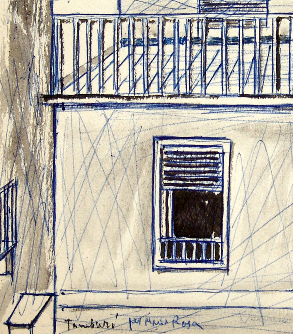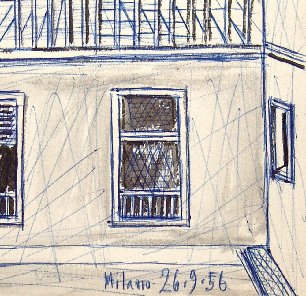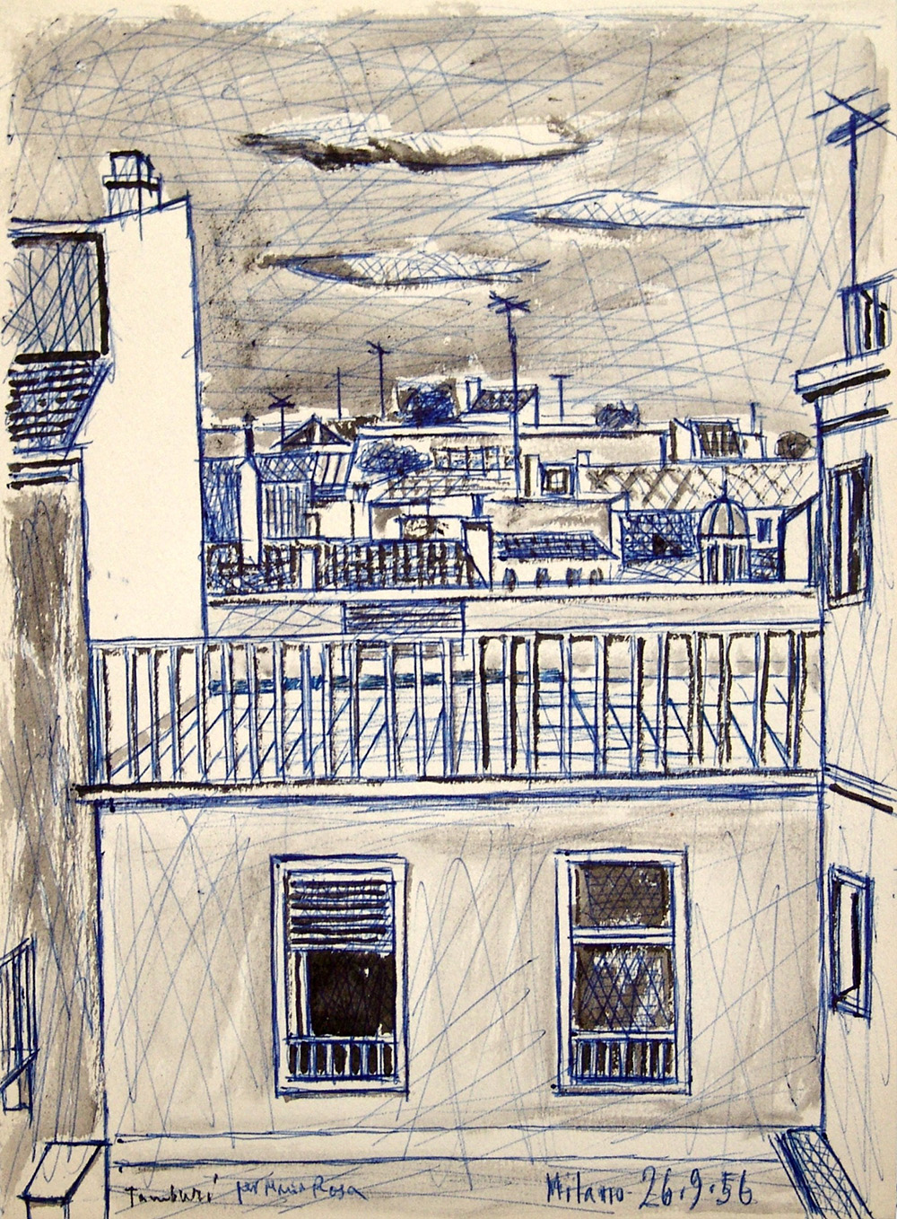 Orfeo Tamburi 1910, Jesi (An) - 1994, Parigi (Francia) - [Italia] Milano penna e china acquerellata su carta 27x20,5 cm 1956 firma dell'artista in basso a sinistra certificato di autenticità della Meeting Art di Vercelli