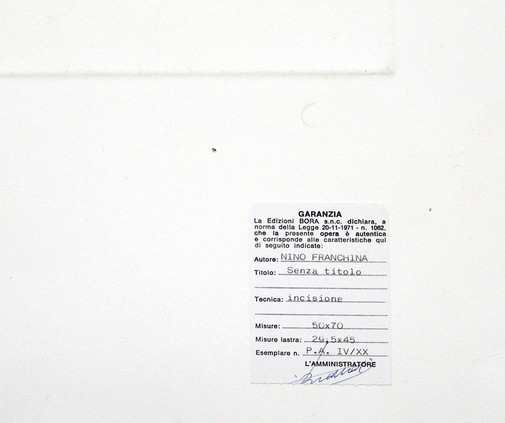 Nino Franchina 1912, Palmanova (Ud) - 1987, Roma (Rm) - [Italia] senza titolo acquaforte acquatinta 70x50 cm es. p.a. IV/XX; firma dell’artista in basso a destra certificato di autenticità della Edizioni Bora di Bologna sul retro