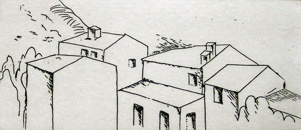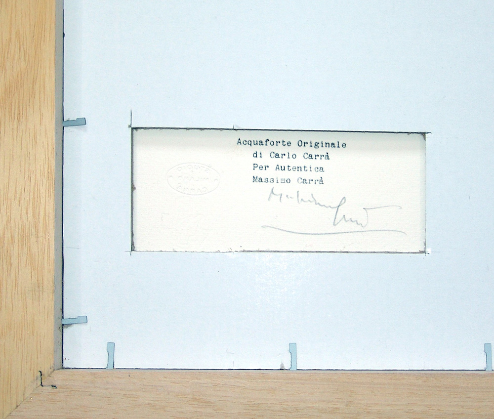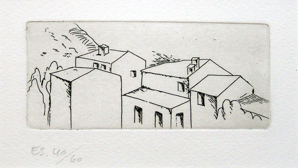 Carlo Carrà 1881, Quargnento (Al) - 1966, Milano (Mi) - [Italia] Case a Belgirate acquaforte 53x38 cm 1971 es. 40/60; lastra incisa nel 1922; f.to incisione 5,8x12,4 cm; Editore Luigi De Tullio; opera con cornice autentica di Massimo Carrà sul retro con timbro dello Studio Carrà