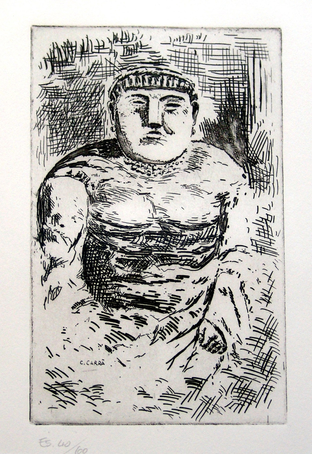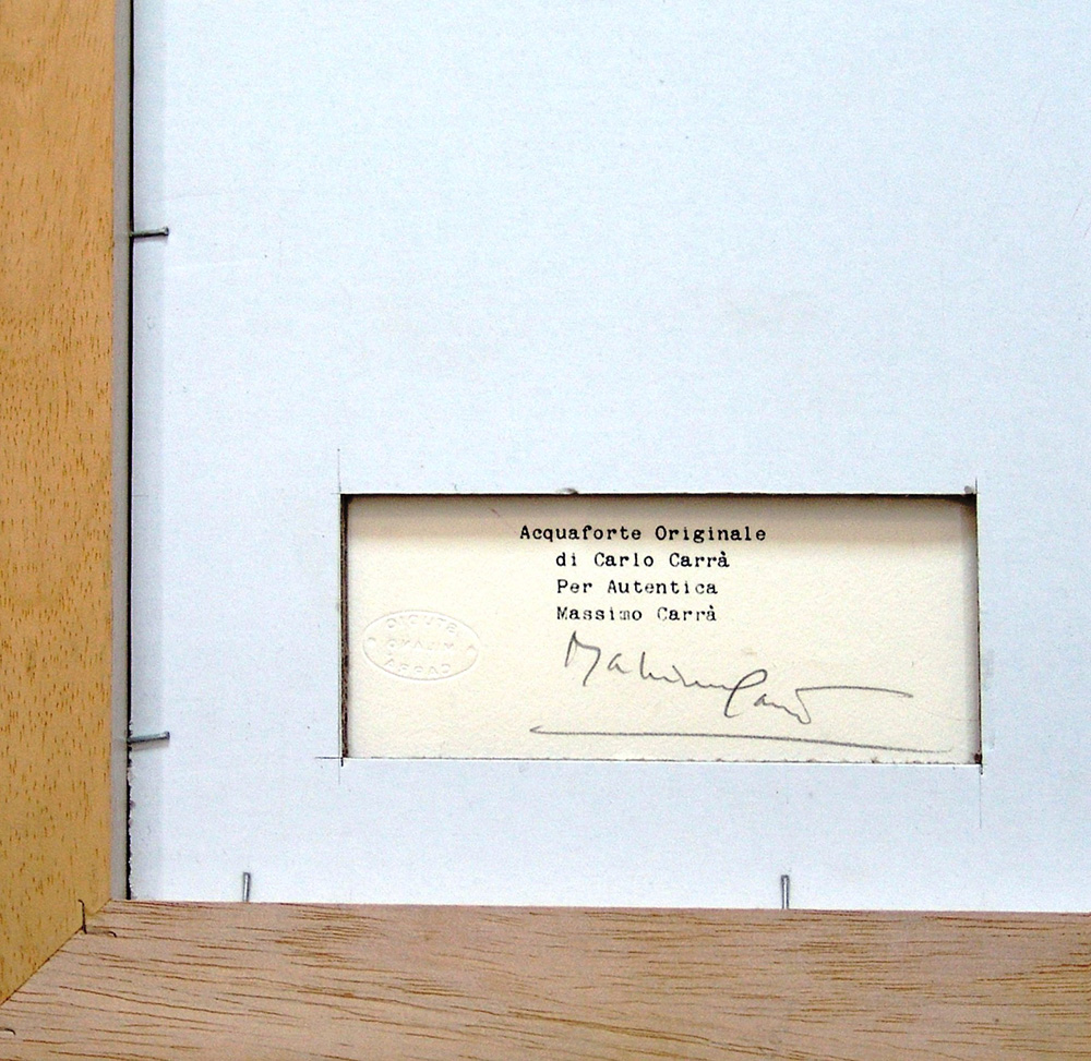 Carlo Carrà 1881, Quargnento (Al) - 1966, Milano (Mi) - [Italia] L'idolo acquaforte 53x38 cm 1971 es. 40/60; firma dell'artista sulla lastra incisa nel 1922; f.to incisione 21,3x14,3 cm; Editore Luigi De Tullio; opera con cornice autentica di Massimo Carrà sul retro con timbro dello Studio Carrà