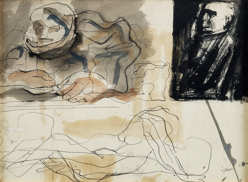 Mario Sironi COMPOSIZIONE china, tempera diluita, tempera e matita grassa su cartoncino, cm 24x33,6 databile al 1950 circa L’opera è registrata presso l’Associazione per il Patrocinio e la Promozione della Figura e dell’opera di Mario Sironi, Milano con il n. 92/18 RA
