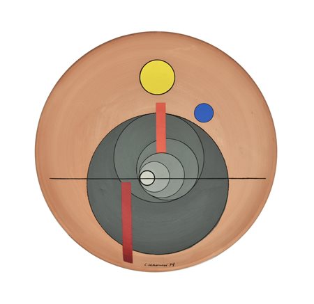 Luigi Veronesi COMPOSIZIONE acrilico su piatto in terracotta, diametro cm 24,5 firmato e datato eseguito nel 1979
