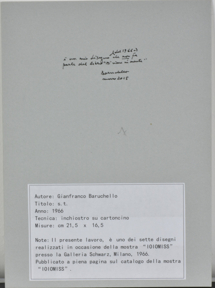 Gianfranco Baruchello SENZA TITOLO inchiostro su cartoncino, cm 21,5x16,5 sul retro: firmato e datato eseguito nel 1966 Esposizioni: IOIOMISS, Galleria Schwarz, Milano 1966, ivi ripr. Il presente lavoro è uno dei sette disegni realizzati in occasione della mostra Iomissis tenutasi presso la Galleria Schwarz di Milano nel 1966