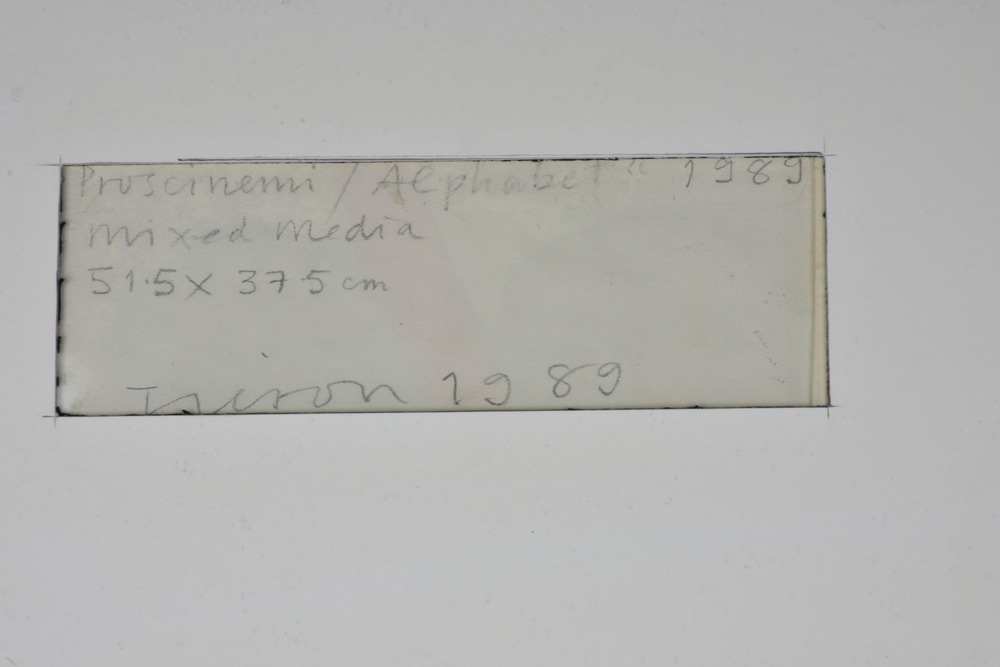 Joe Tilson PROSCINEMI / ALPHABET tecnica mista su carta, cm 51,5x37,5 firmato e datato sul retro: firmato, titolato e datato eseguito nel 1989