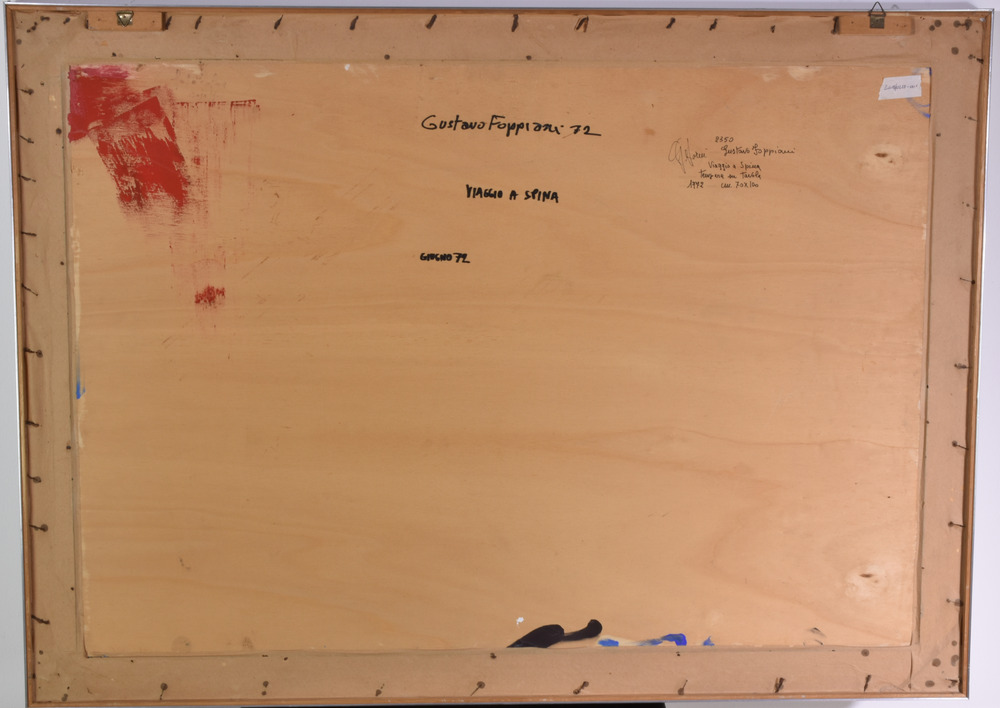 Gustavo Foppiani VIAGGIO A SPINA tempera su tavola, cm 70x100 firmato e datato sul retro: firmato, titolato e datato eseguito nel 1972 Provenienza: Galleria Forni, Bologna Collezione privata, Bologna
