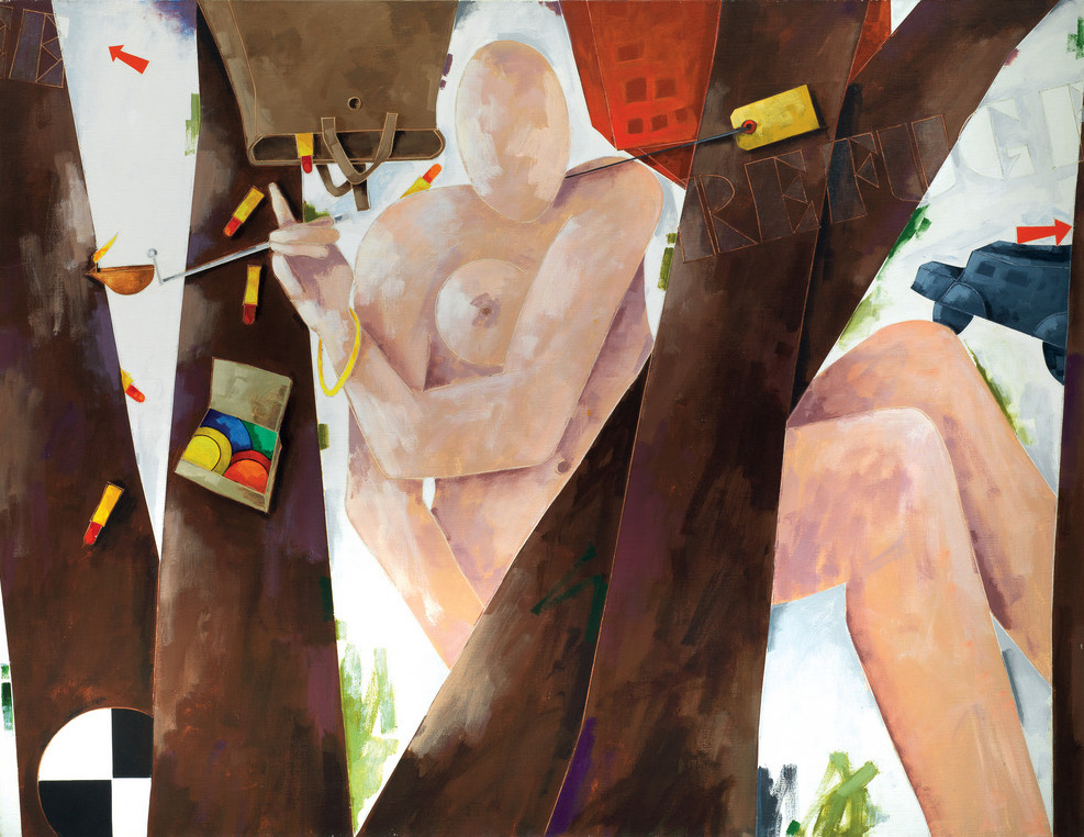 Emilio Tadini PROFUGO IN BOSCO acrilico su tela, cm 114x147 sul retro: firma e titolo eseguito nel 1987 L'opera è accompagnata da autentica dell'artista su fotografia Provenienza Studio Marconi, Milano Collezione privata, Milano