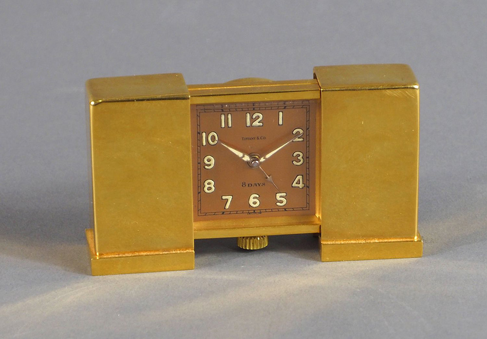 Tiffany & C.: orologio sveglia da tavolo "8 days" in ottone dorato (lung cm. 10 aperto).