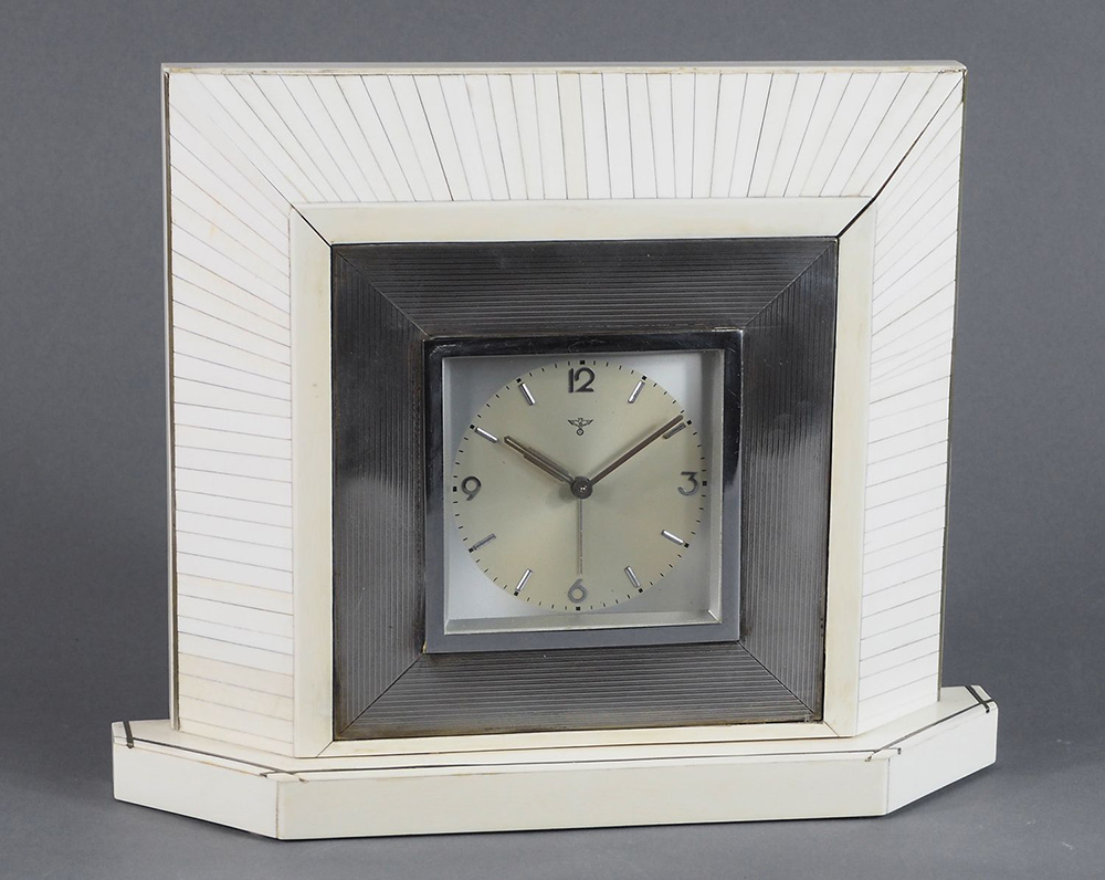 Orologio da tavolo in avorio e argento. Lung. cm. 30.