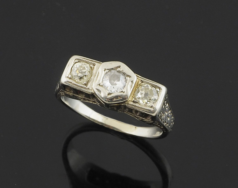 Anello in oro bianco a ponte con montatura traforata e 3 diamanti taglio antico, primi '900