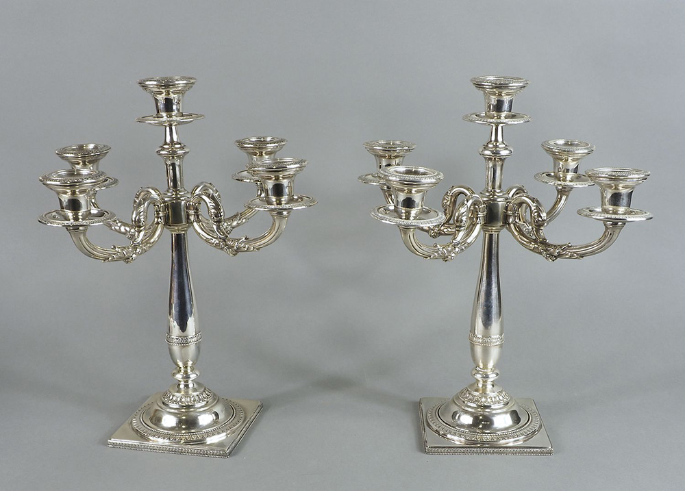 Paio di grandi candelabri in argento a 5 fiamme con teste di cigno. H. cm. 37. gr. netti 2420.