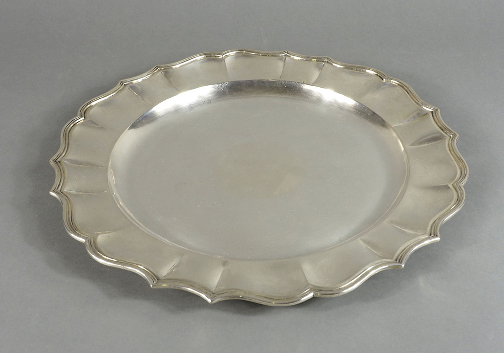 Piatto rotondo in argento con bordo sagomato. Diam. cm. 34. gr. 860.