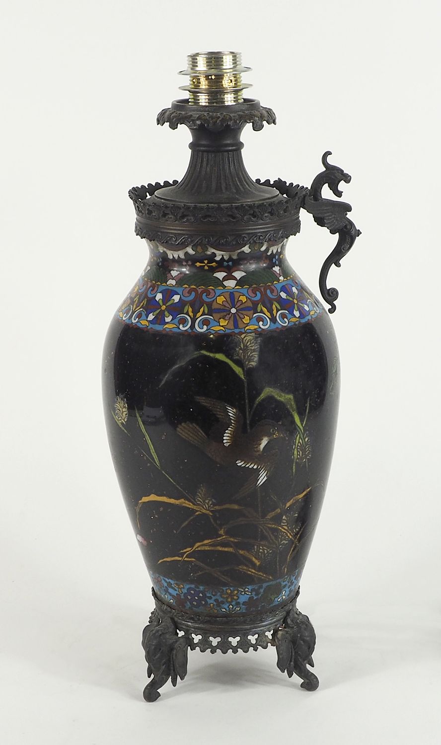 Grande vaso a lavorazione cloisonnè con montature in bronzo, trasformato a lampada. H cm. 47.