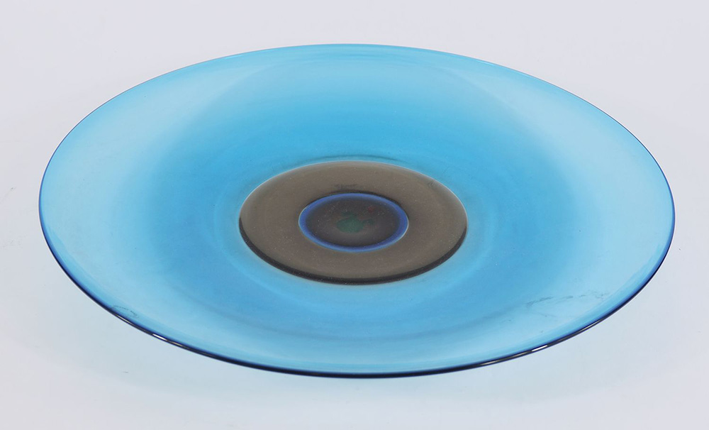 Venini: grande piatto rotondo in vetro blu trasparente, con etichetta...