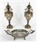 Lotto in porcellana policroma con decori di scene galanti composto da coppia di vasi e centrotavola ovale. H. cm. 42. (difetto).
