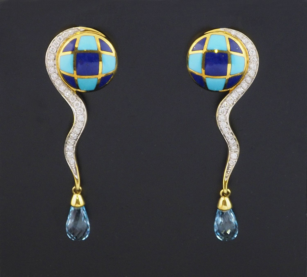 Orecchini pendenti in oro giallo parte superiore con smatli blu e azzurri, in finale ad onda ricoperta di diamanti