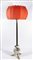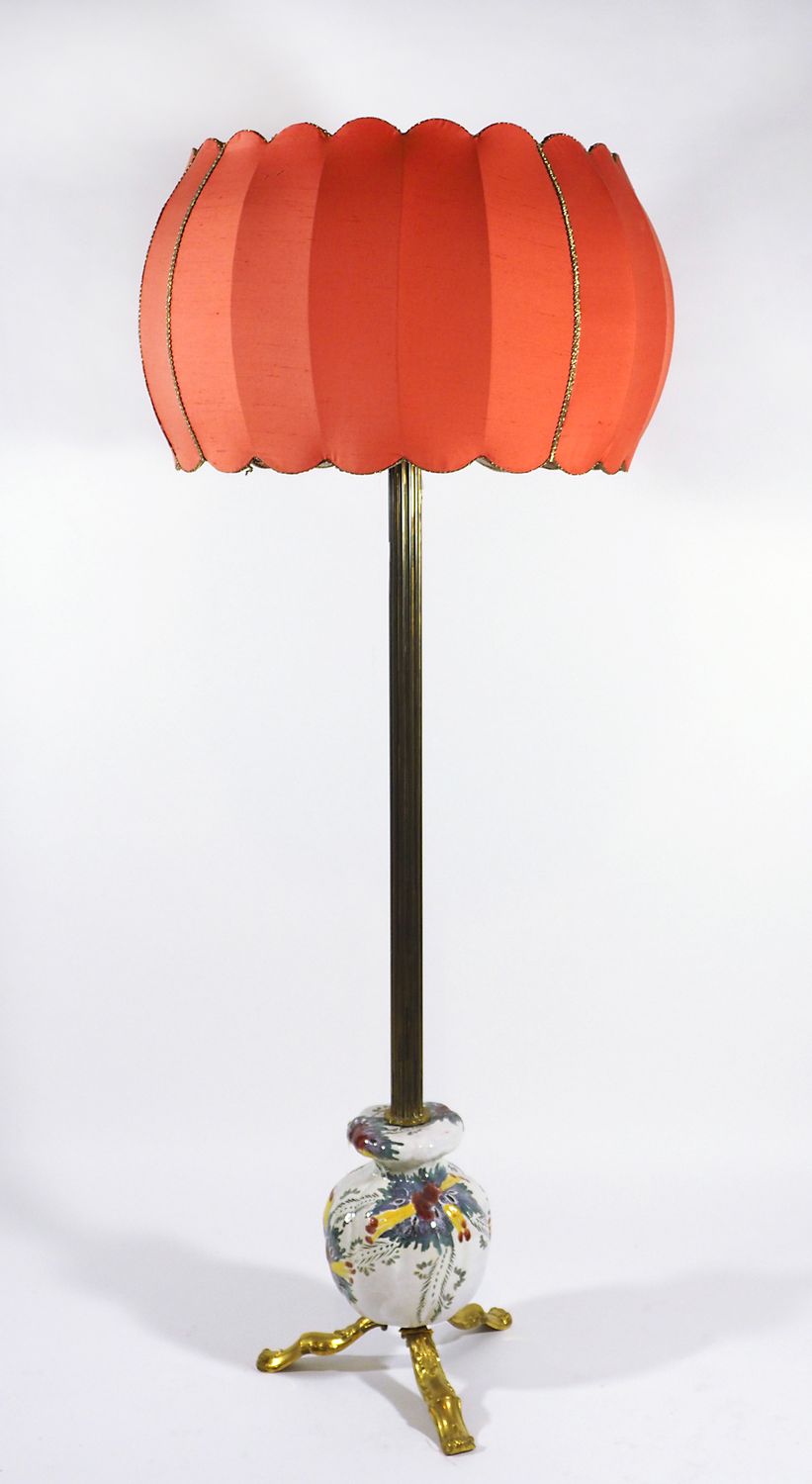 Lampada a stelo con fusto in ceramica policroma e bronzo, con grande...