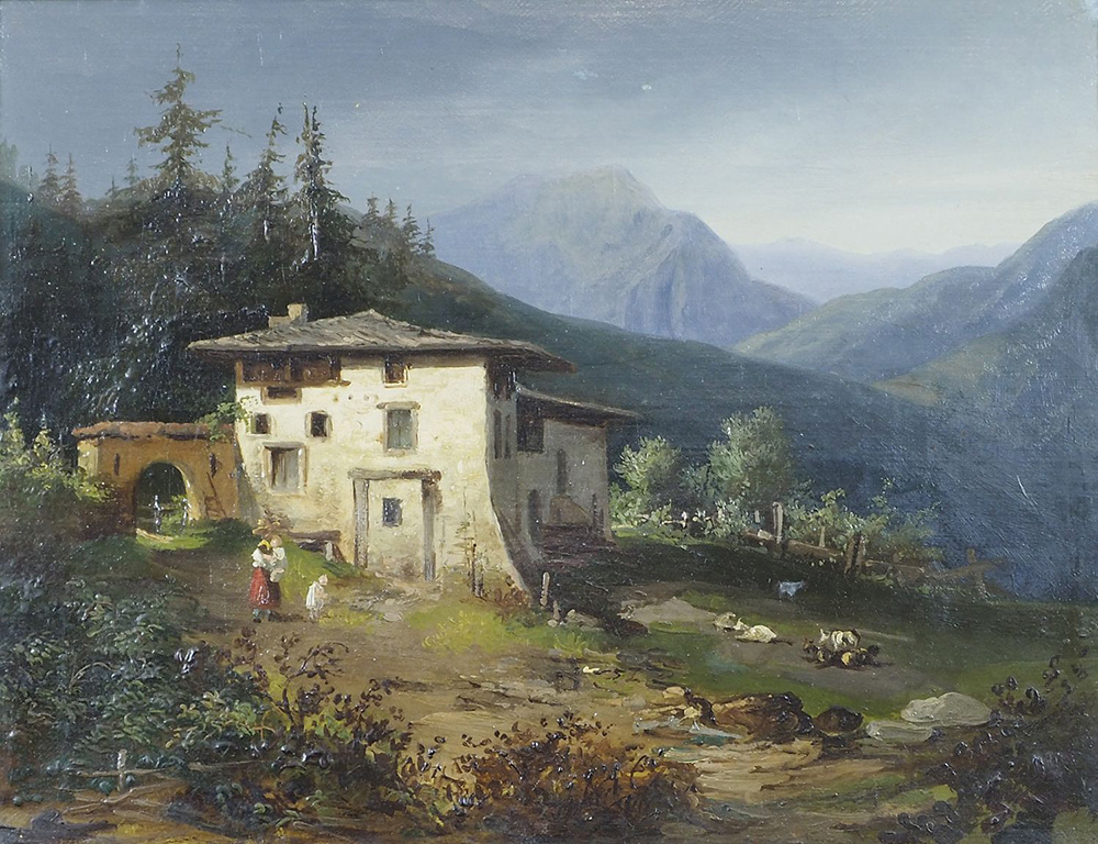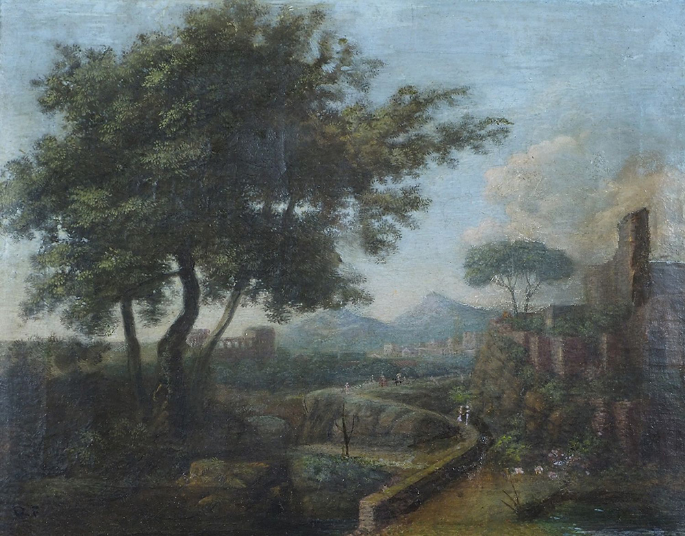 Maestro del XVIII secolo "Due paesaggi" cm. 23x29 - olio su tela Uno dei due dipinti è siglato D.F. In collezione erano stati attribuiti a Lorenzo Scarambellato (XVIII-XIX). Prov.: collezione Basilio Trieste.