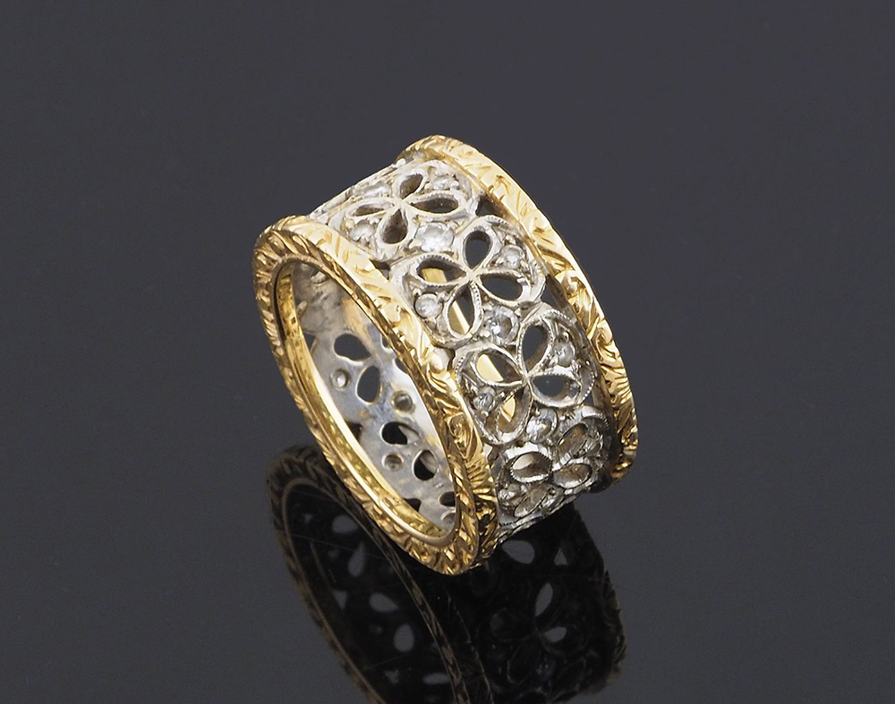 Anello a fascia in oro giallo e bianco con lavorazione a traforo e piccoli diamantini