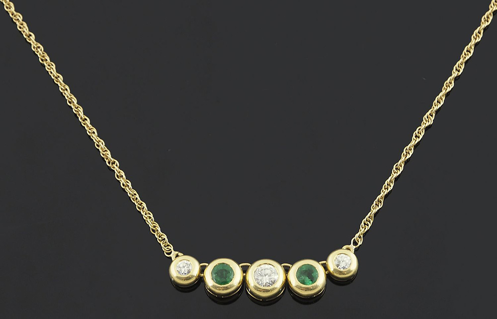 Collana girocollo in oro giallo con al centro 5 elementi rotondi con all'interno diamanti alternati da smeraldi
